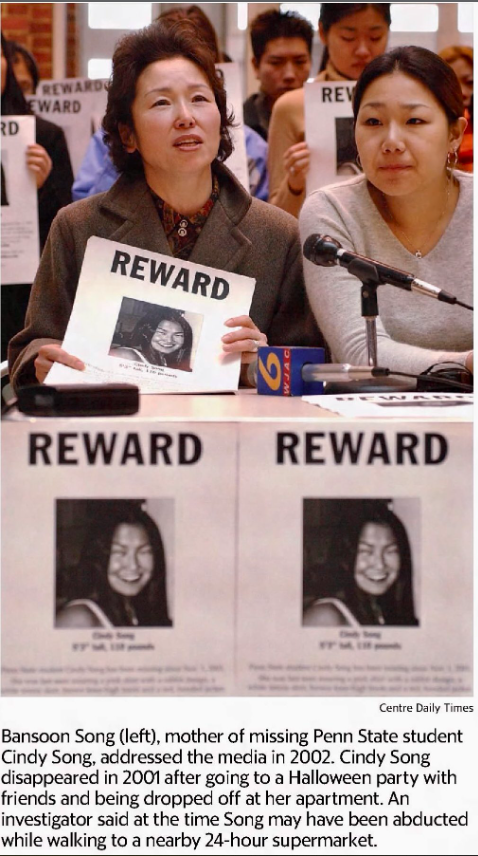 2001 онд Пенсильвани мужийн их сургуулийн оюутан Синди Сон охин Хэллоуины баярын үдэш найзуудын хамт үдэшлэгт оролцохоор гэрээсээ гарчээ. Туулайн чих зүүж, ягаан өнгийн топ, цагаан өнгийн банзал өмссөн түүнийг үүрийн 04:00 цагийн үед найзууд нь гэрийнх нь үүдэнд буулгажээ.