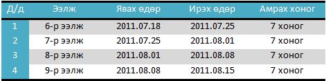 2011 оын зуны ээлжийн хуваарь