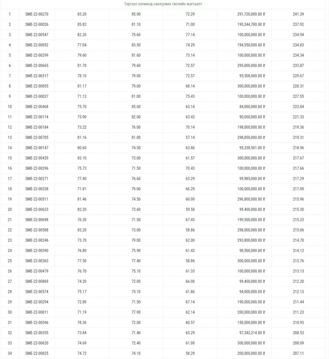 Ингэхдээ гурван шатны нийлбэр дүнгээр хамгийн өндөр оноо авсан 34 төслийг 6,1 тэрбум төгрөгөөр эхний ээлжинд санхүүжүүлэхээр болсон юм.