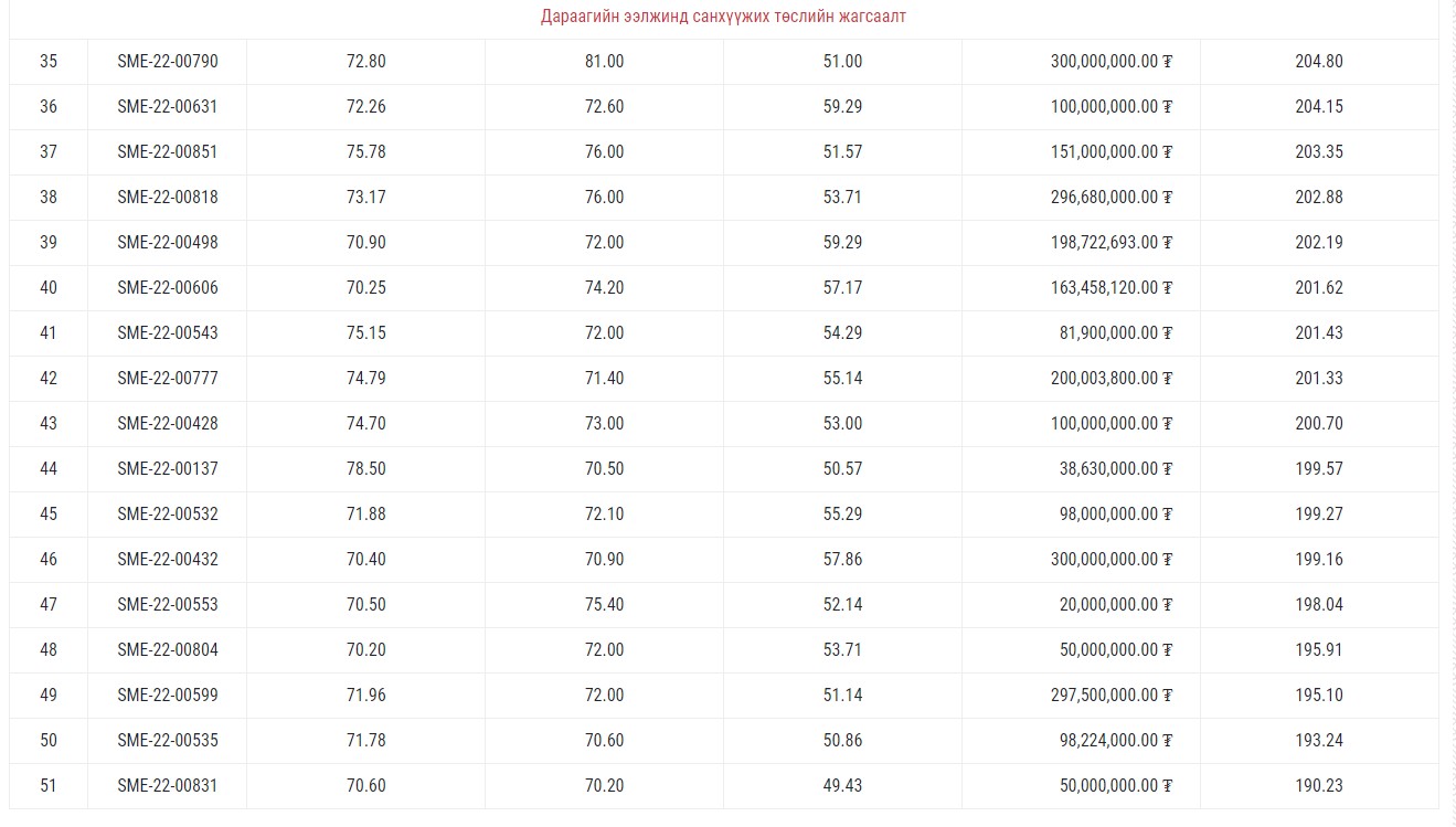 Төсөл хүлээн авах хугацаанд нийт 867 төслийн 105.4 тэрбум төгрөгийн хүсэлтийг ирүүлснээс цахим системд 571 аж ахуйн нэгж 82.4 тэрбум төгрөгийн зээлийн хүсэлтээ баталгаажуулсан байна. Үүнээс Улаанбаатар хотод 226 төслийн хүсэлт хүлээн авснаас төсөл сонгон шалгаруулалтын эцсийн шат буюу Хорооны хуралд 8,6 тэрбум төгрөгийн санхүүжилт бүхий 51 төсөл шалгарч үлдээд байсан юм.