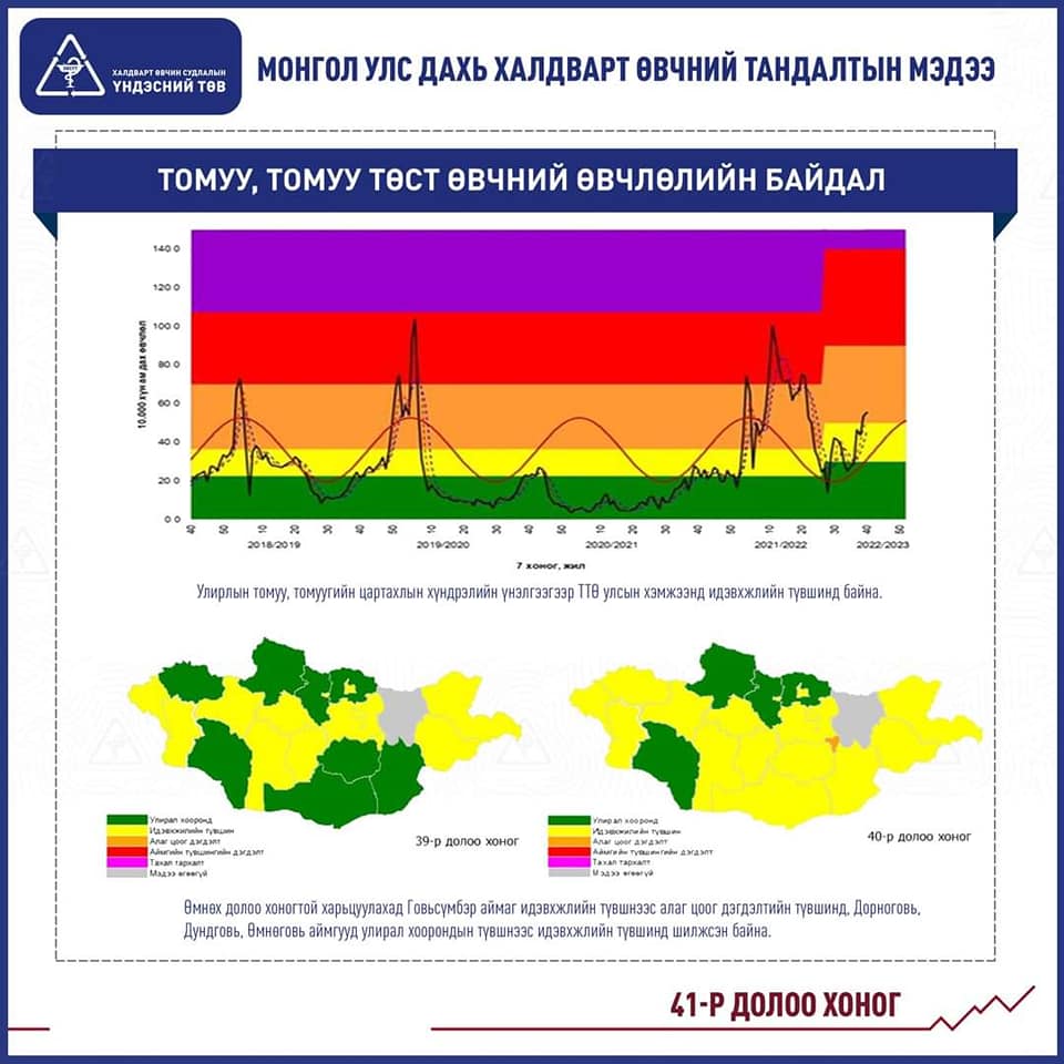 Томуу, томуу төст өвчний нөхцөл байдлын тойм мэдээг хүргэж байна. 41-р долоо хоног Улирлын томуу, томуугийн цартахлын хүндрэлийн үнэлгээгээр ТТӨ улсын хэмжээнд идэвхжлийн түвшинд байна.