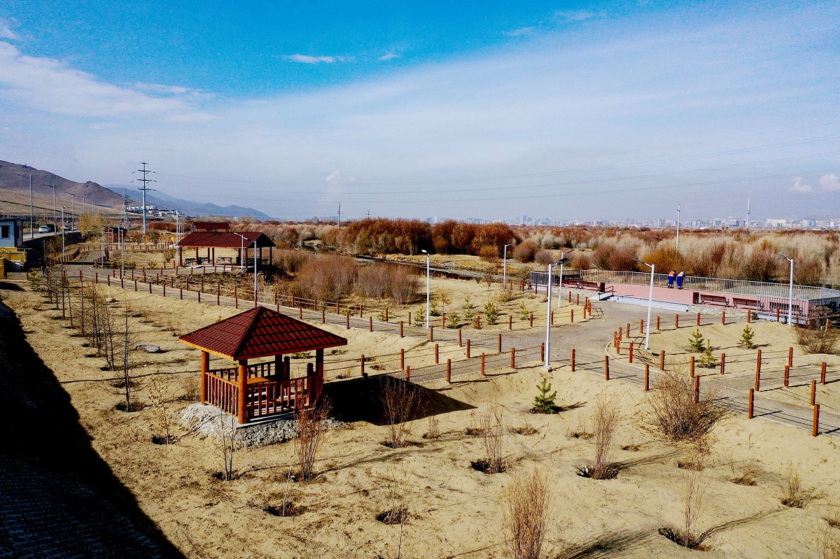 Асем Вилла хотхоны баруун хойд талд, Туул голын эрэг дагуу 1.3 га талбайг ногоон байгууламж, авто зогсоол, сүүдрэвч, асар, усан тавцан, гэрэлтүүлэг, шорлогны талбай, ариун цэврийн байгууламж зэргээр тохижуулж байна. Энэ хүрээнд ногоон байгууламжийн 7500 ам метр талбайн тэгшилгээ, хог тээвэрлэлт зэрэг ажил бүрэн дуусжээ. Түүнчлэн хөрсний бүтэц, хөлдөлтийн түвшинг тооцоолон явган хүний 1300 ам метр зам тавьж байгаа аж. Нийт гүйцэтгэл 90 хувьтай байна.
