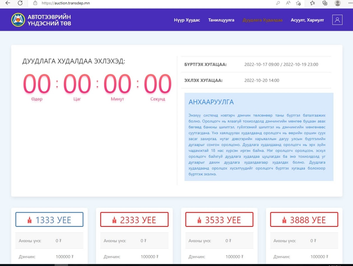 Автотээврийн Үндэсний Төв Төрийн өмчит үйлдвэрийн газрын захирлын 2020 оны 12 дугаар сарын 08-ны өдрийн А/287 тоот тушаалын хүрээнд “Тээврийн хэрэгслийн улсын бүртгэлийн дугаарыг дуудлага худалдаагаар зохион байгуулах” удирдамжаар улсын дугаарын дуудлага худалдааг 2021 оны 02 дугаар сарын 15-ны өдрөөс зохион байгуулж эхэлсэн.