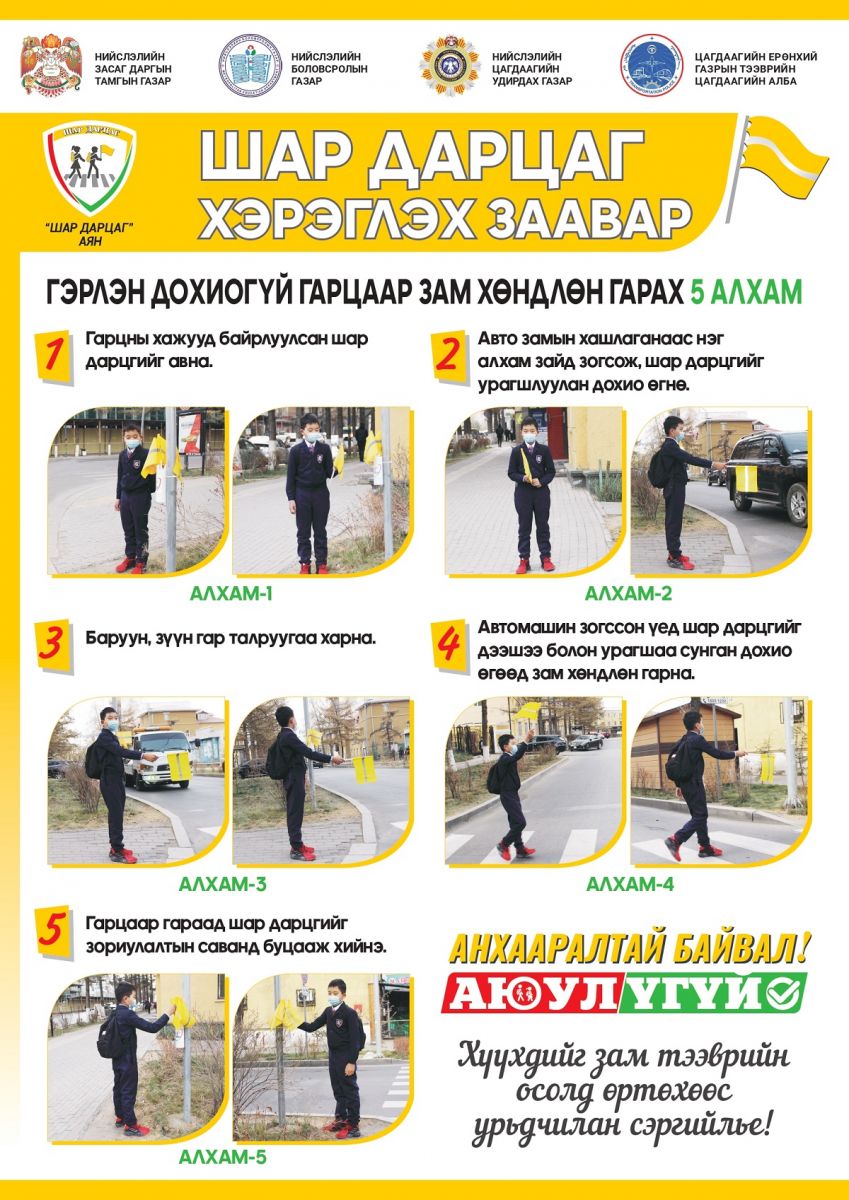 “Сүүлийн таван жилийн байдлаар манай улсын хэмжээнд зам тээврийн ослоор 196 хүүхэд амиа алдаж, 4956 хүүхэд гэмтэл авсан харамсалтай тоон мэдээ байна. НЗДТГ-аас 2021 оноос Замын хөдөлгөөнд оролцогчийн аюулгүй байдлыг хангах, хүүхдийг гэмт хэрэг, зөрчилд өртөхөөс урьдчилан сэргийлэх, хохирогч болох эрсдэлийг бууруулах, зөв дадал хэвшлийг бий болгох зорилгоор “Шар дарцаг” аяныг санаачлан хэрэгжүүлж эхэлсэн. Уг аянд нийслэлийн ерөнхий боловсролын сургууль, цэцэрлэгүүд идэвх санаачилгатай оролцсон төдийгүй орон нутагт ч дэмжин хэрэгжүүлсэн.