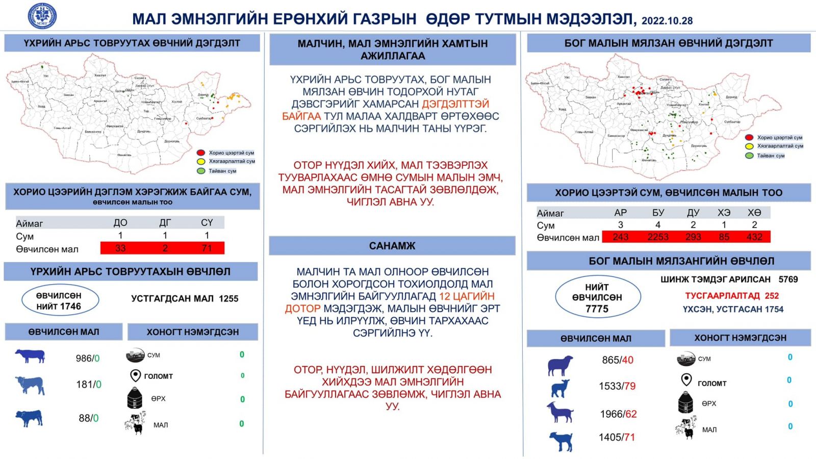 Мал эмнэлгийн Ерөнхий газраас гаргасан /2022.10.28/ мэдээллээс харахад бог малын мялзан өвчний улмаас Архангай, Булган, Дундговь, Хэнтий, Хөвсгөл аймгийн нийт 12 суманд хорио цээрийн дэглэм тогтоогоод байгаа аж. Одоогийн байдлаар нийт 7000 гаруй бог мал мялзан өвчнөөр өвчлөөд байгаа бөгөөд тэдгээрийн 1754 нь үхэж, устсан байна.
