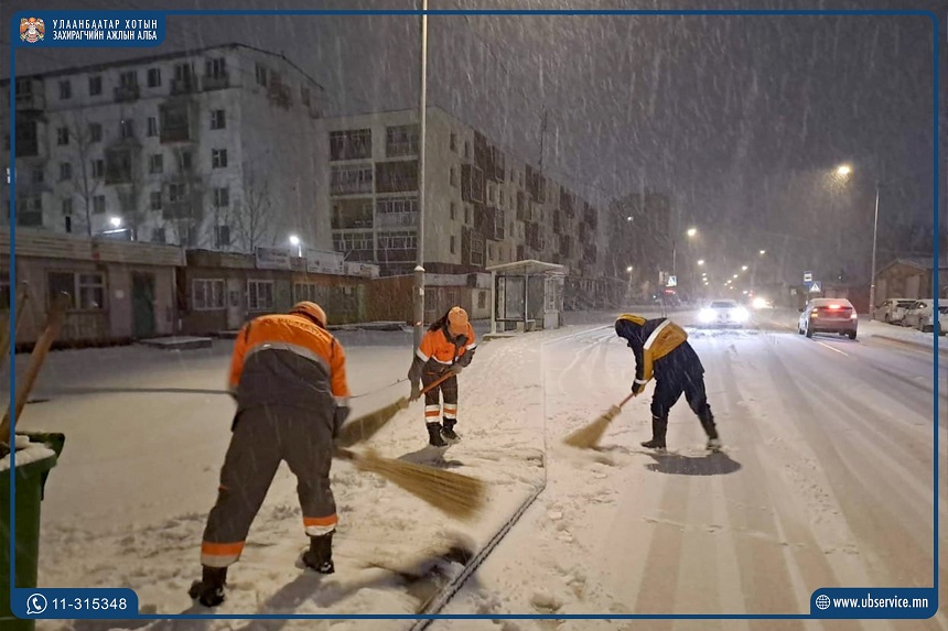 Хотын дарга өчигдөр орсон цастай холбоотойгоор нөхцөл байдал ямар байгааг Улаанбаатар хотын Ерөнхий менежер бөгөөд Захирагчийн ажлын албаны дарга Д.Ганболдоос тодруулахад “Өнгөрсөн ням гарагт Улаанбаатар хотод 04:30 цагаас цас орж эхэлсэн. Дүүргийн ЗДТГ, ТҮК бэлтгэлтэй байж, 06:00 цагаас цэвэрлэгээг эхлүүллээ. 1099 хүн тусгай зориулалтын 103 машин, техниктэй ажиллаж, 344.9 тонн давс, 111.2 тонн бодис цацсан. Одоо ч давс, бодис цацах ажил үргэлжилж байна. Давсны 4874.1 тонн, бодисын 3000 тонн орчим нөөцтэй” хэмээлээ.
