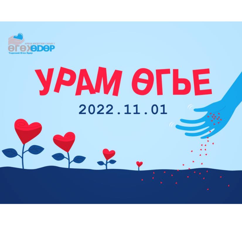 “Өгөх өдөр хөдөлгөөн” ТББ-аас жил бүрийн 11-р сарын 1-ний өдрийг "Үндэсний өгөх өдөр" болгон тэмдэглэж ирсэн. 12 дахь жилдээ зохион байгуулагдаж буй тус өдрийг энэ жил “Урам өгье” уриан дор тэмдэглэн өнгөрүүлж байгаа бөгөөд энэ хүрээндээ төдийлөн ил гараад байдаггүй ч нийгэм, олон нийтэд тустай үйл хэрэг бүтээж байгаа 9 ТББ, хувь хүнийг сонгон алдаршуулж “урам өгсөн” юм. ҮҮНД: