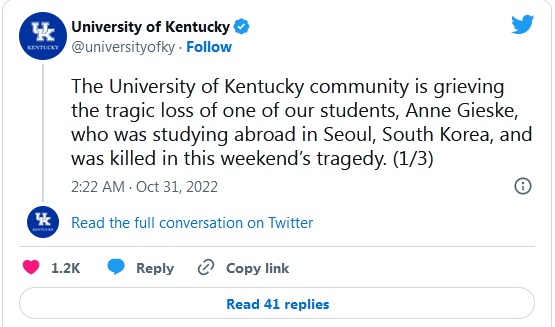 Тус эмгэнэлт үйл явдлыг дуулсан төрөлх Кентаккигийн их сургуулийн хамт олон “Өмнөд Солонгосын Сөүл хотод солилцооны хөтөлбөрт хамрагдаж байсан оюутнууд минь амралтын өдөр болсон аймшигт үйл явдлын хохирогчид болсонд бид бүгд гүнээ эмгэнэн гашуудаж байна. Ар гэрийнхэнд нь эмгэнэл илэрхийлье” хэмээн олон нийтийн сүлжээнд бичсэнийг FOX NEWS онцолжээ.