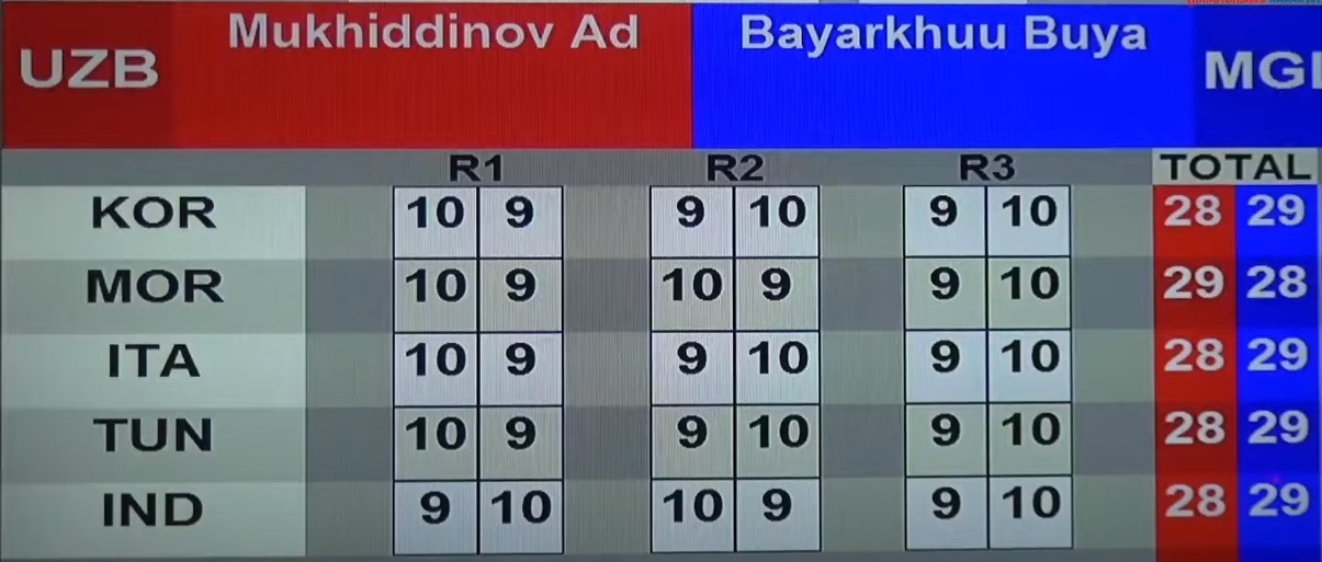 Өнөөдөр манай 5 тамирчин рингэнд гарахаас хамгийн түрүүнд 60 кг-ын жингийн Б.Буяндалай Узбекистаны тамирчин Адханжон Мухиддиновтой тулалдлаа. Манай тамирчин эхний үеийг алдсан ч үлдсэн үеүдэд итгэл төгс тэргүүлж, ялалт байгууллаа.