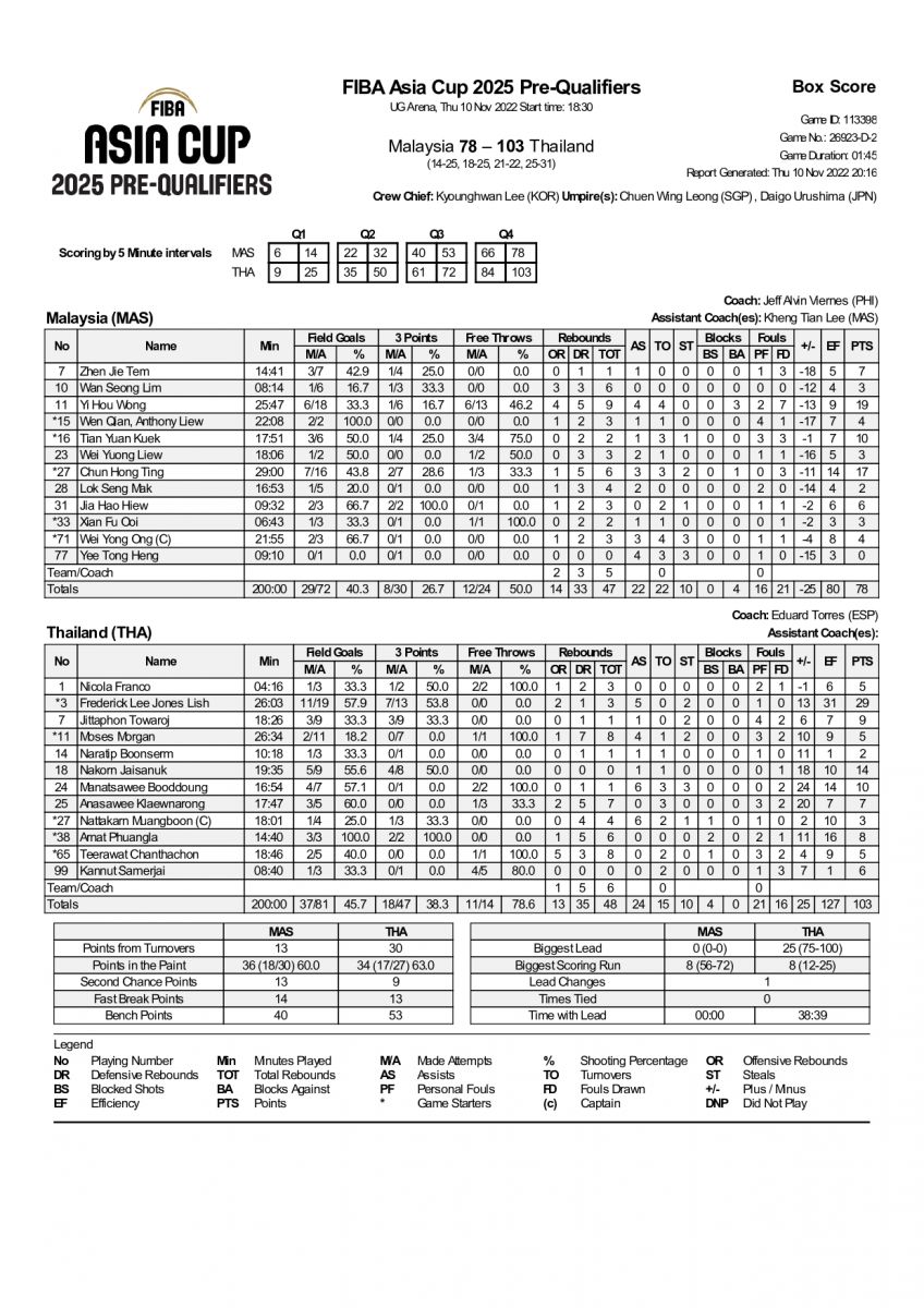 Тус тоглолтод Тайландын шигшээ багаас Фредерик Ли Жонес Лиш 29 оноо, 5 дамжуулалт өгч байгаа тэргүүлсэн бол Малайзын багаас И Хоу Вон 19 оноо, 9 самбартайгаар тоглолтыг дуусгалаа.