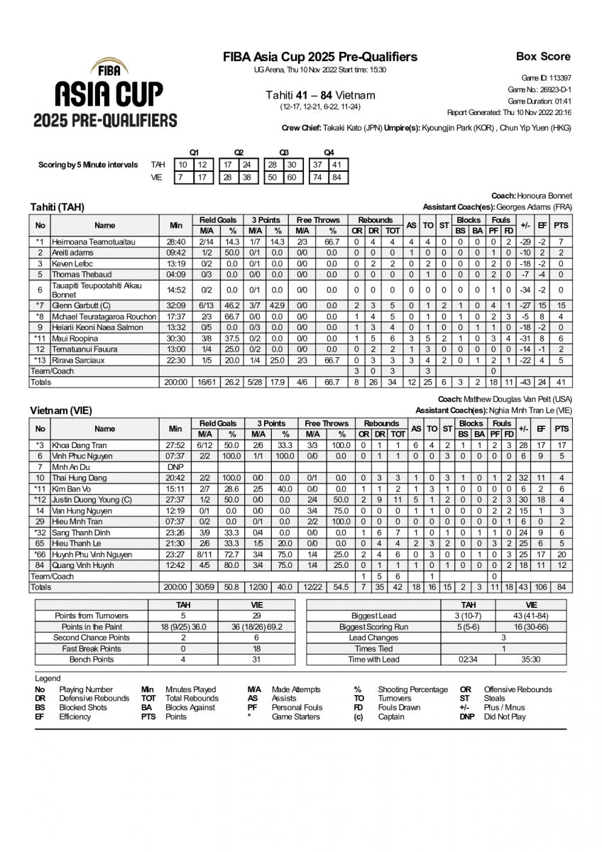 Ингэснээр Вьетнамын шигшээ гайхалтай ялалт авч тэмцээнээ эрчтэй эхлүүллээ. Тус тоглолтод Вьетнамын багаас Хуйн Фу Вин Нгуен 20 оноо 6 самбар авч багаа тэргүүлсэн бол Тахити улсын багаас Гленн Гарбутт 15 оноо, 4 самбар авч багаа тэргүүлжээ.