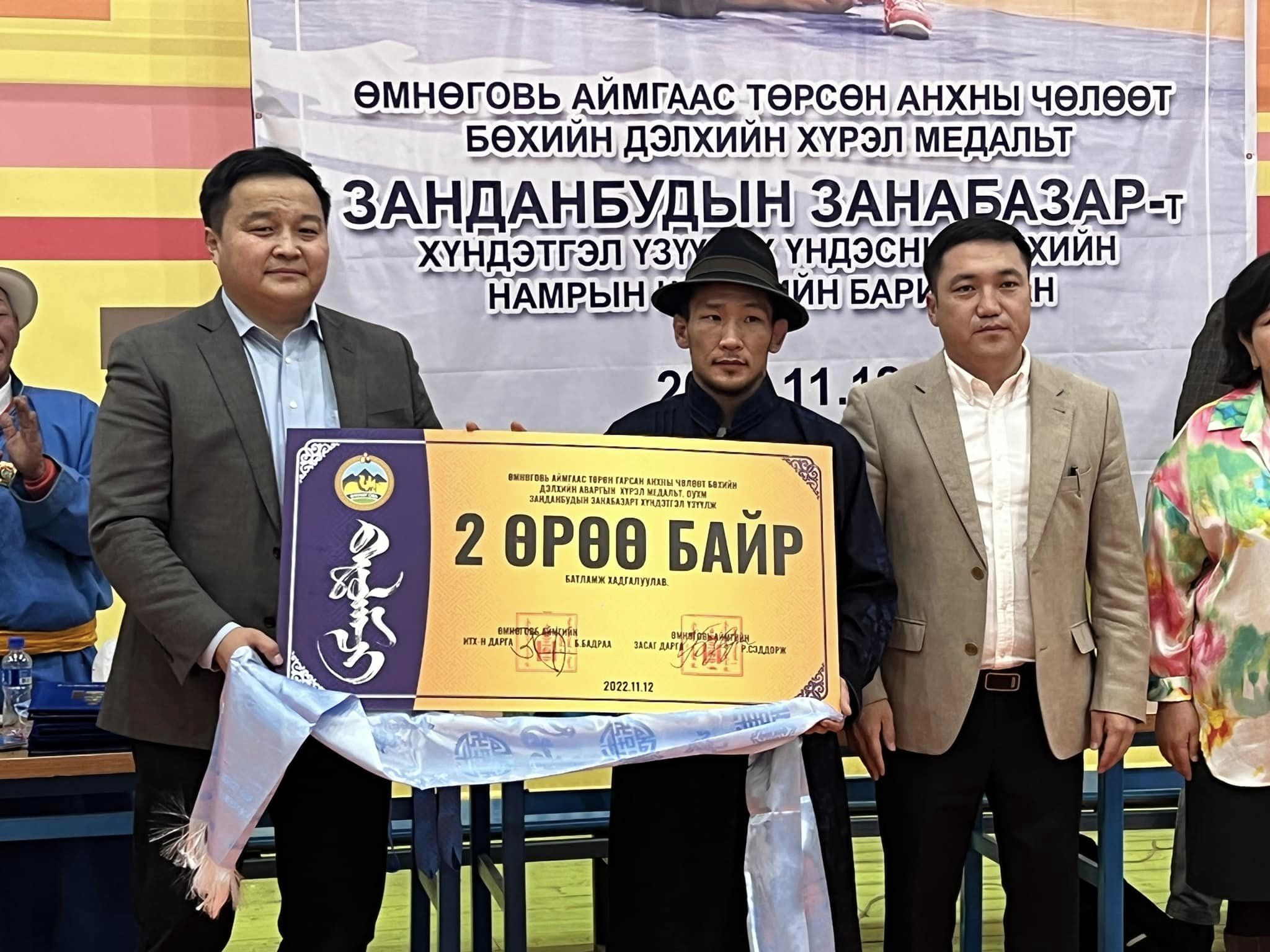 Түүний энэхүү бахархам амжилтыг мялааж, Өмнөговь аймгаас хүндэтгэлийн барилдаан зохион байгуулж, аймгийн удирдлагууд 2 өрөө орон сууцаар бэлэг барилаа.