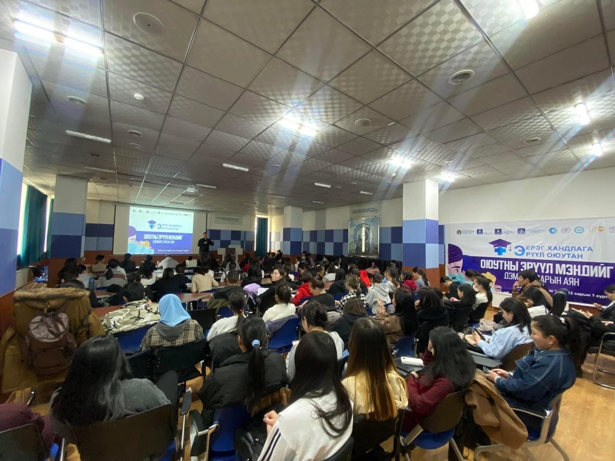 Эерэг хандлага-Эрүүл оюутан” уриатай оюутны эрүүл мэндийг дэмжих сарын аяны хүрээнд 2022 оны арваннэгдүгээр сарын 10-ны өдөр МУБИС-ийн оюутан залуусын дунд Нийгмийн эрүүл мэндийн үндэсний төв, Сэтгэцийн эрүүл мэндийн үндэсний төв хамтран оюутан залуусын тулгамдсан асуудлууд болох “Нөхөн үржихүй- Гэр бүл төлөвлөлт”, “БЗДХ-Хэрхэн урьдчилан сэргийлэх вэ”, “Архи, тамхины хор уршиг”, “Эрүүл зөв хооллолт”, “Залуусын сэтгэлзүйн эрүүл мэнд”, “Осол гэмтлийн үед үзүүлэх анхны тусламж”, “Амны хөндийн эрүүл мэнд” сэдвээр эрүүл мэндийн мэдлэг олгох сургалт зохион байгуулж, 135 оюутан залуус хамрагдаж эрүүл мэндийн  мэдлэг, мэдээллээ дээшлүүллээ.
