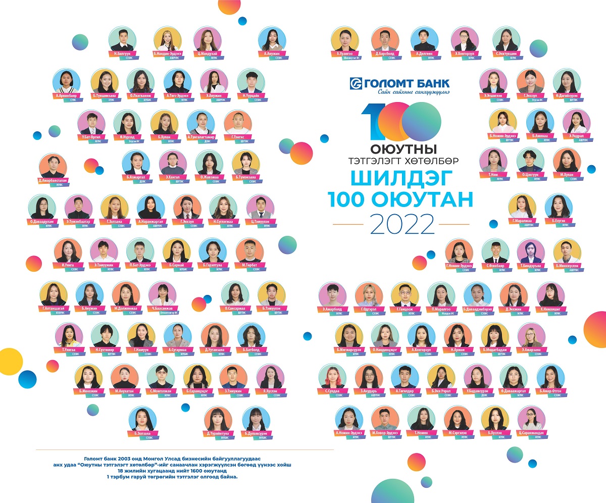 Боловсролыг дэмжигч Голомт банкнаас жил бүр зохион байгуулдаг “Оюутны тэтгэлэгт хөтөлбөр-2022”-т шалгарсан шилдэг 100 оюутныг тодрууллаа. Нийт 13 их, дээд сургуулиас тодорсон шилдэг 100 оюутанд батламж болон мөнгөн тэтгэлэг гардуулах ёслолын ажиллагаа 11 дүгээр сарын 11-нд болсон юм.