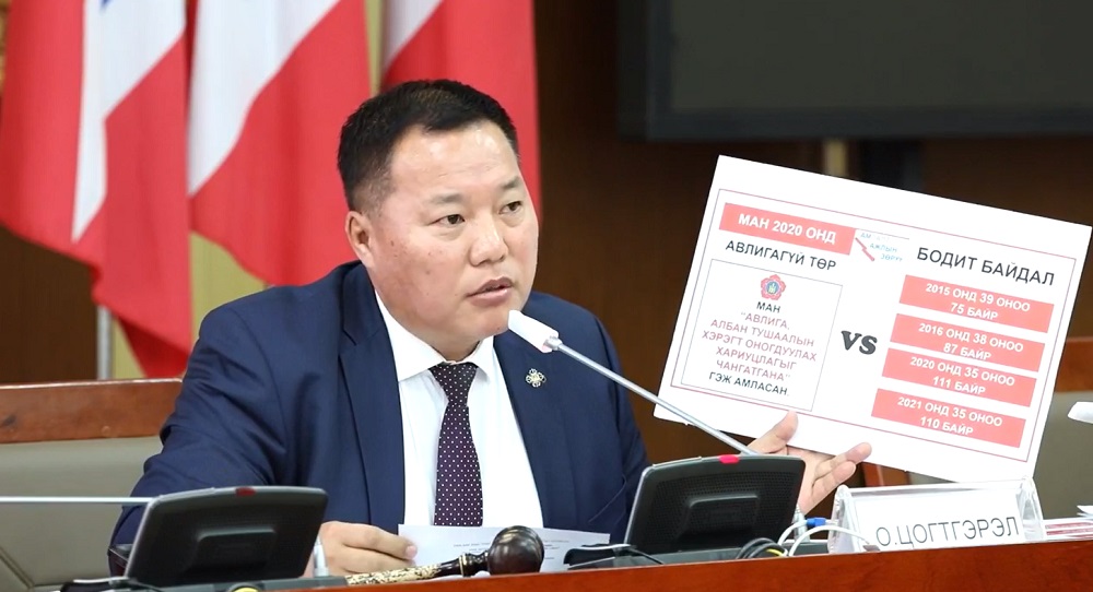 АН-ын бүлгийн дарга О.Цогтгэрэл “Монгол Улсын эдийн засгийн 40 хувь нь төсвөөр дамжиж, хязгаарлагддаг болсон. 2016 онд 26 хувь байсан бол одоогоор нийт эдийн засгийн 40 хувь нь төсвөөр дамждаг болсон. Үүн дээр нэмэгдээд төрийн өмчит компаниудын борлуулалтын орлого 55 их наяд төгрөг буюу Монгол Улсын дотоодын нийт бүтээгдэхүүнтэй тэнцүү хэмжээний борлуулалтын орлого хийдэг болсон. Энэ төржсөн эдийн засгийн цаана авлига хээл хахууль, албан тушаалын асуудлууд гардаг.