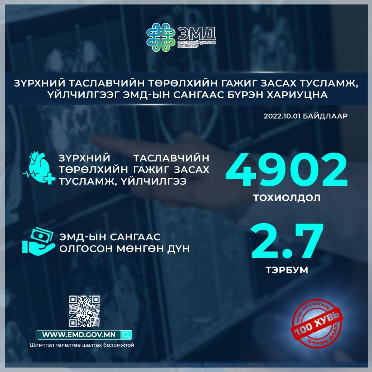 Зүрхний таславчийн төрөлхийн гажгуудын тусламж, үйлчилгээг Эрүүл мэндийн даатгалын сангаас 100 хувь хариуцна.