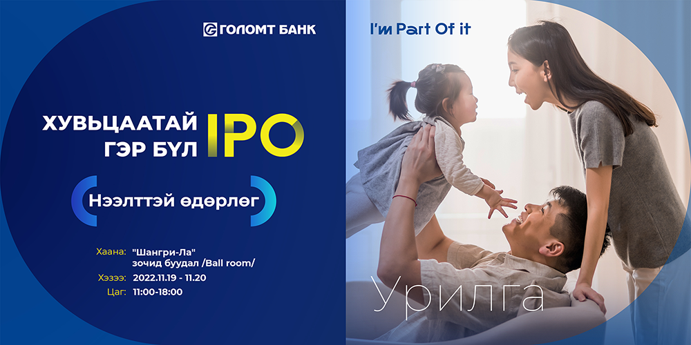 Учир нь яг энэ цаг үед Монгол Улсын иргэн бүр, хүүхэд бүрд банк, санхүүгийн салбарт тэргүүлэгч, системийн 20 хувийг дангаар бүрдүүлэгч Голомт банкны хувьцааны эзэн болох түүхэн мөч тохиож байна. Та энэхүү боломжийг алдалгүйгээр ирэх амралтын өдрүүдэд буюу 11-р сарын 19, 20-нд Shangri-La зочид буудлын нэгдүгээр давхарт байрлах хүлээн авалтын их танхимд зочилж, Голомт банкны хувьцааны талаарх бүхий л мэдээлэл, заавар зөвлөгөөг авахаас гадна тус банкны үйл ажиллагаа, бүтээгдэхүүн үйлчилгээ, 27 жилийн ололт амжилт, өсөлтийн стратеги, санхүүгийн үр дүн зэрэг мэдээллийг нэг дороос аваарай.