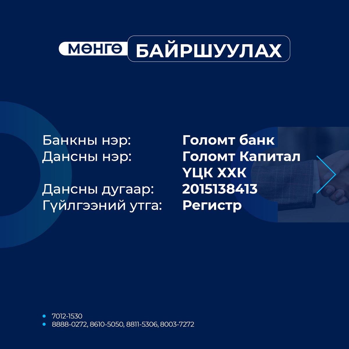 Мөн та хувьцааны талаарх дэлгэрэнгүй мэдээллийг www.ipo.golomtbank.com вэбсайтаас авахаас гадна Голомт банкны 1800-1646 болон Голомт Капитал компанийн 7012-1530 дугаарын утсанд холбогдож авах боломжтой.