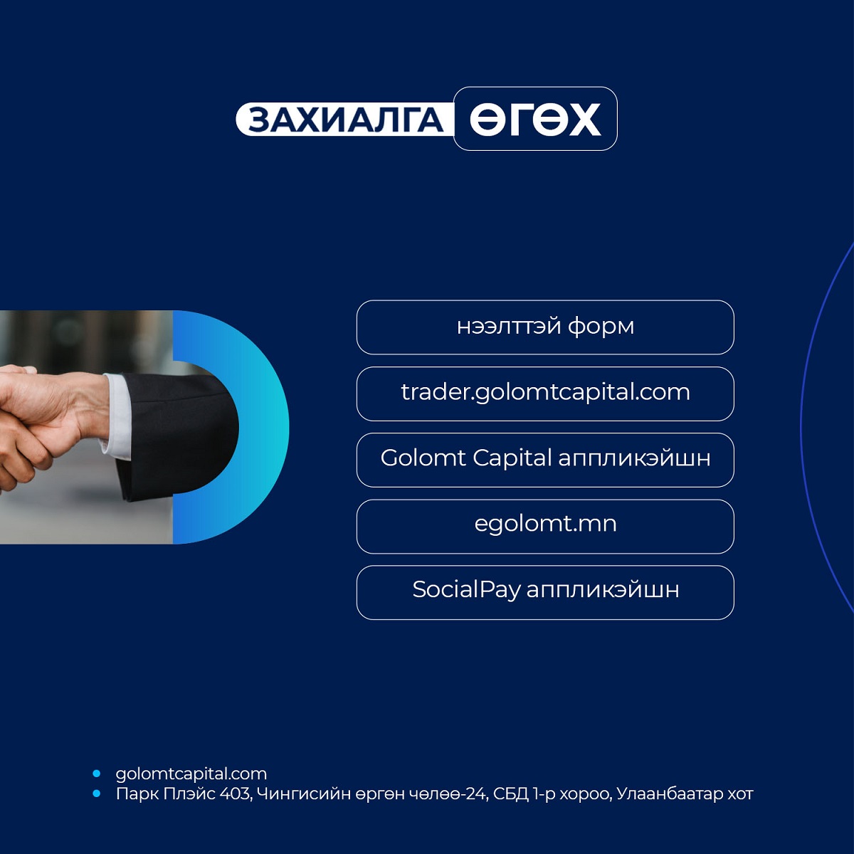 Мөн www.egolomt.mn, Social Pay аппликэйшн, Голомт Капитал компанийн байранд ирээд дансаа үнэгүй нээлгээд, хувьцаагаа захиалах боломжтой.