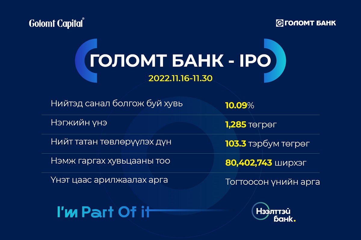 -Голомт банк нь Монголын хөрөнгийн зах зээлийн түүхэнд урьд өмнө гарч байгаагүй том дүнтэй IPO-г хийж байна. Энэ хэрээр Монголын хөрөнгийн зах зээл тэлэх нь тодорхой юм.