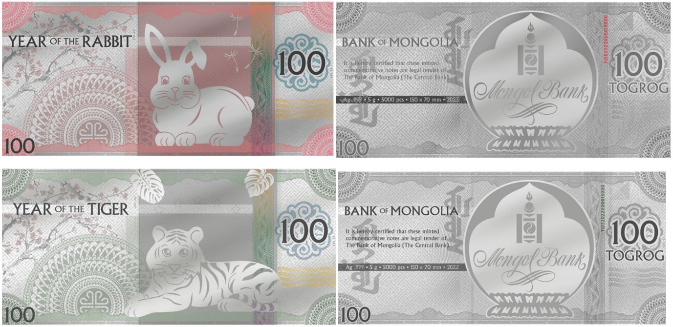 Зоосны мэдээлэл: “Туулай жил”, “Бар жил” франчайз дурсгалын ялтсан дэвсгэртүүд нь 100 төгрөгийн нэрлэсэн үнэтэй 5 гр жинтэй 999 сорьцтой цагаан мөнгөөр үйлдвэрлэгдсэн, 150мм*65мм хэмжээтэй өнгөт дурсгалын зоос.