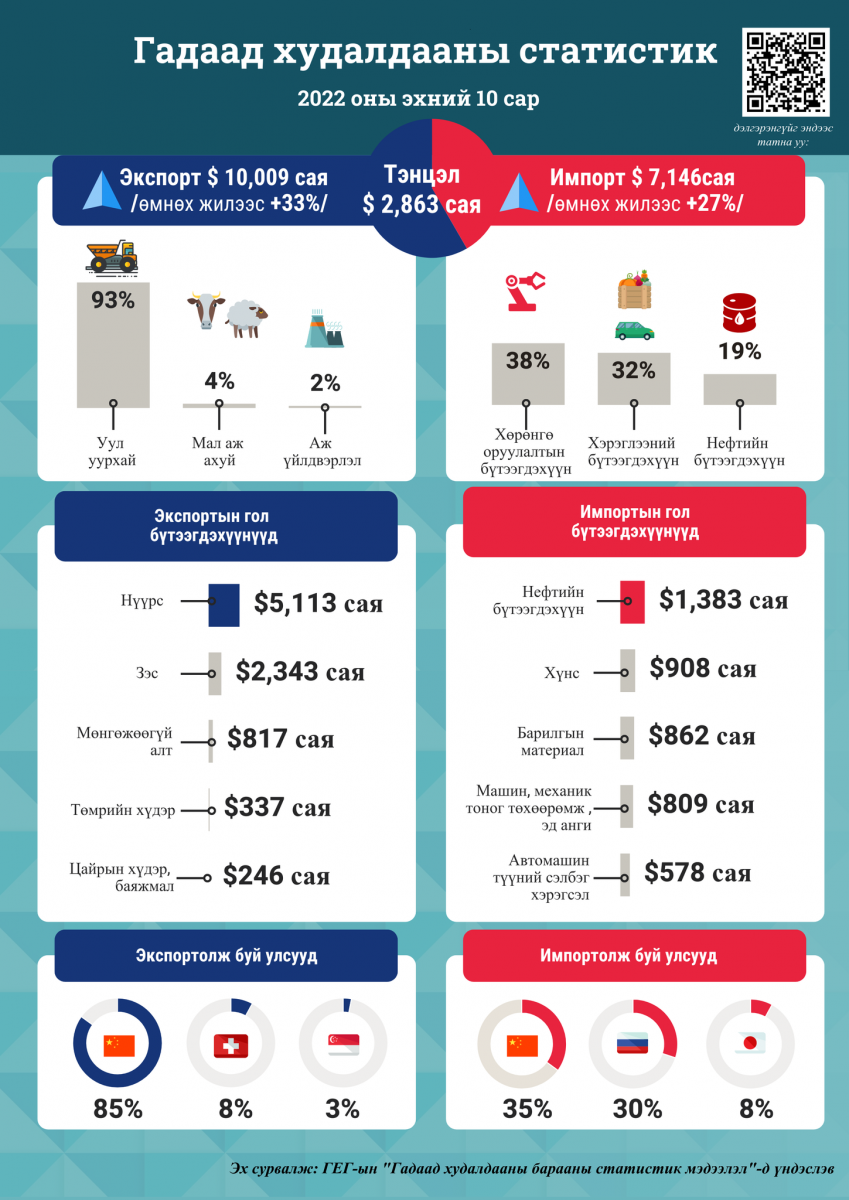Энэ оны эхний арван сарын байдлаарх гадаад худалдааны статистик мэдээллийг дараах инфографикаар хүргэж байна.