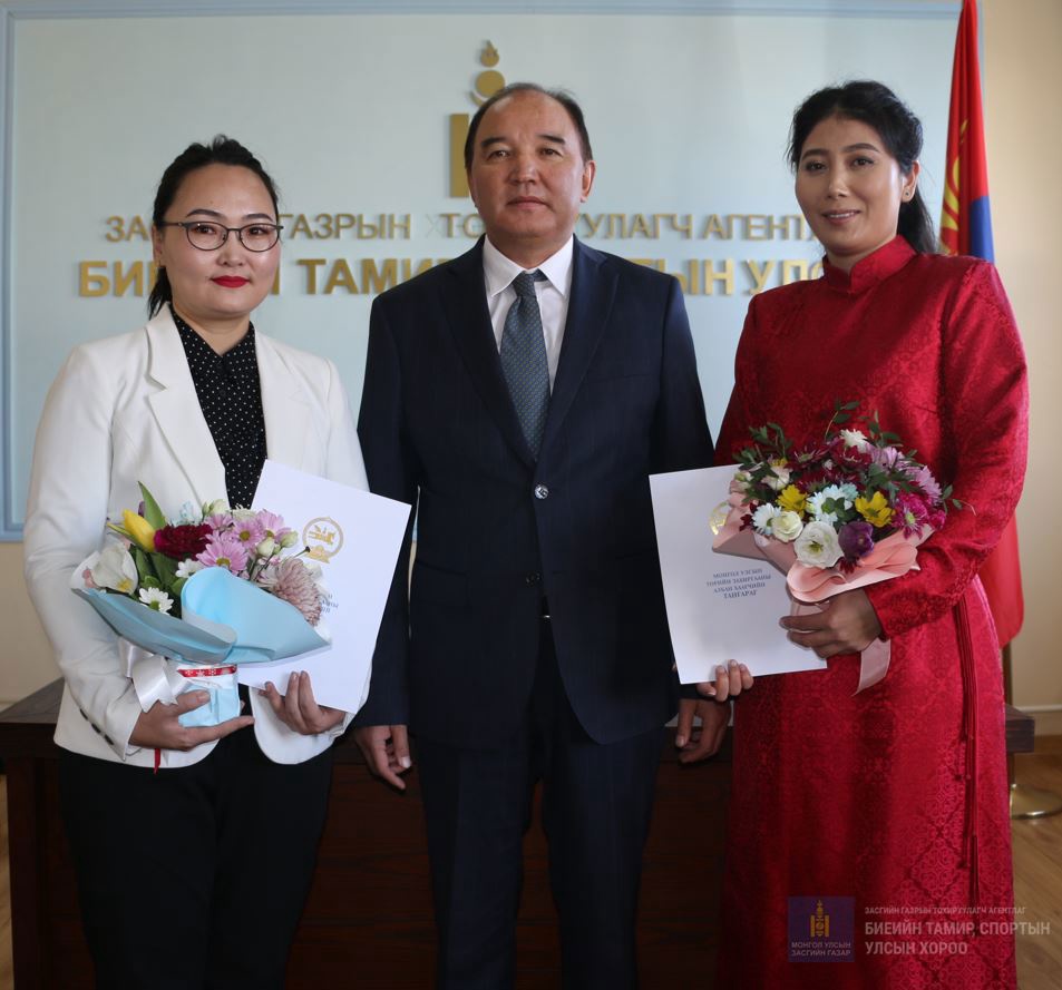 Монгол Улсын Төрийн албаны тухай хууль, Монгол Улсын Ерөнхийлөгчийн 1995 оны109 дүгээр зарлигаар баталсан “Төрийн захиргааны албан хаагчийн тангараг өргөх ёслолын журам”-ыг үндэслэн Төрийн албаны мэргэшлийн шалгалт өгч, тэнцсэн Биеийн тамир, спортын улсын хорооны хоёр ажилтан өнөөдөр тангараг өргөлөө.
