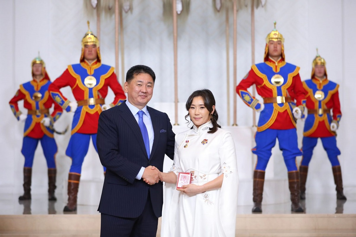 Бүгд Найрамдах Улс тунхагласны 98 жилийн ой, Их эзэн Чингис хааны мэндэлсний 860 жилийн ой, “Монгол бахархлын өдөр”-ийг тохиолдуулан Монгол Улсын Ерөнхийлөгч Ухнаагийн Хүрэлсүх зарлиг гарган тив, дэлхийн тэмцээнд онцгой амжилт гаргаж, эх орныхоо нэр алдрыг өндөрт өргөсөн тамирчид, багш, дасгалжуулагч, бүжгийн спортын хамтлагийг төрийн дээд цол, одонгоор шагнав.