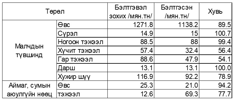Харин аймаг, нийслэл, сум, дүүргийн өвс, тэжээлийн аюулгүйн нөөцөд өвс 21.0 мянган тонн, тэжээл 8.2 мянган тонныг бэлтгэсэн байна. Бэлтгэвэл зохих аймаг, нийслэл, сум, дүүргийн өвс, тэжээлийн аюулгүйн нөөцийн өвсний 94.0 хувийг, тэжээлийн 69.0 хувийг бэлтгэсэн байна. Аймгуудын зах дээр 4.0 мянган тонн өвс, 1.7 мянган тонн тэжээл байгаа мэдээтэй байна.