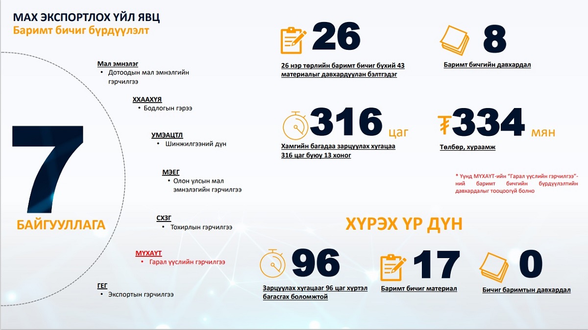 Монгол Улсаас мах, махан бүтээгдэхүүнийг экспортлогч аж ахуйн нэгж нэг удаагийн экспортын баримт бичгийн бүрдүүлэлт хийхдээ нийт давхардсан тоогоор 43 материалыг бэлтгэдэг байна. Өөрөөр хэлбэл, 7 байгууллагаас 26 нэр төрлийн баримт бичиг бүхий 43 материалыг давхардуулан бүрдүүлдэг. Энэ нь 8 баримт бичгийн давхардал үүсгэхээс гадна хамгийн багадаа 316 цаг буюу 13 хоногийг зарцуулдаг.