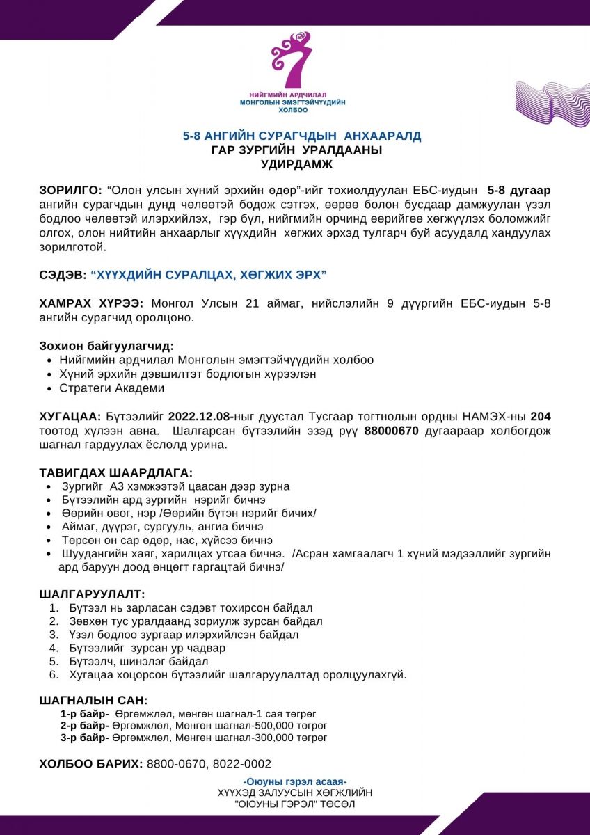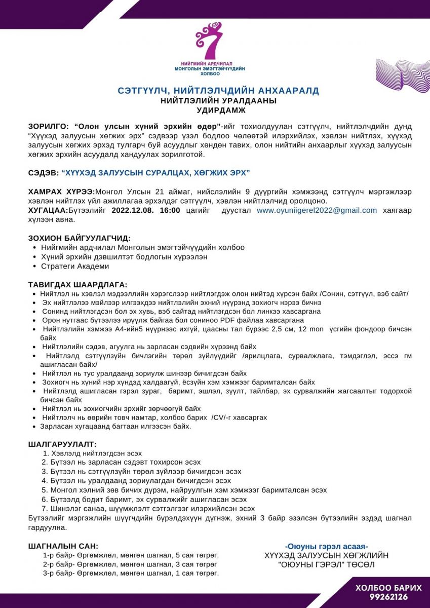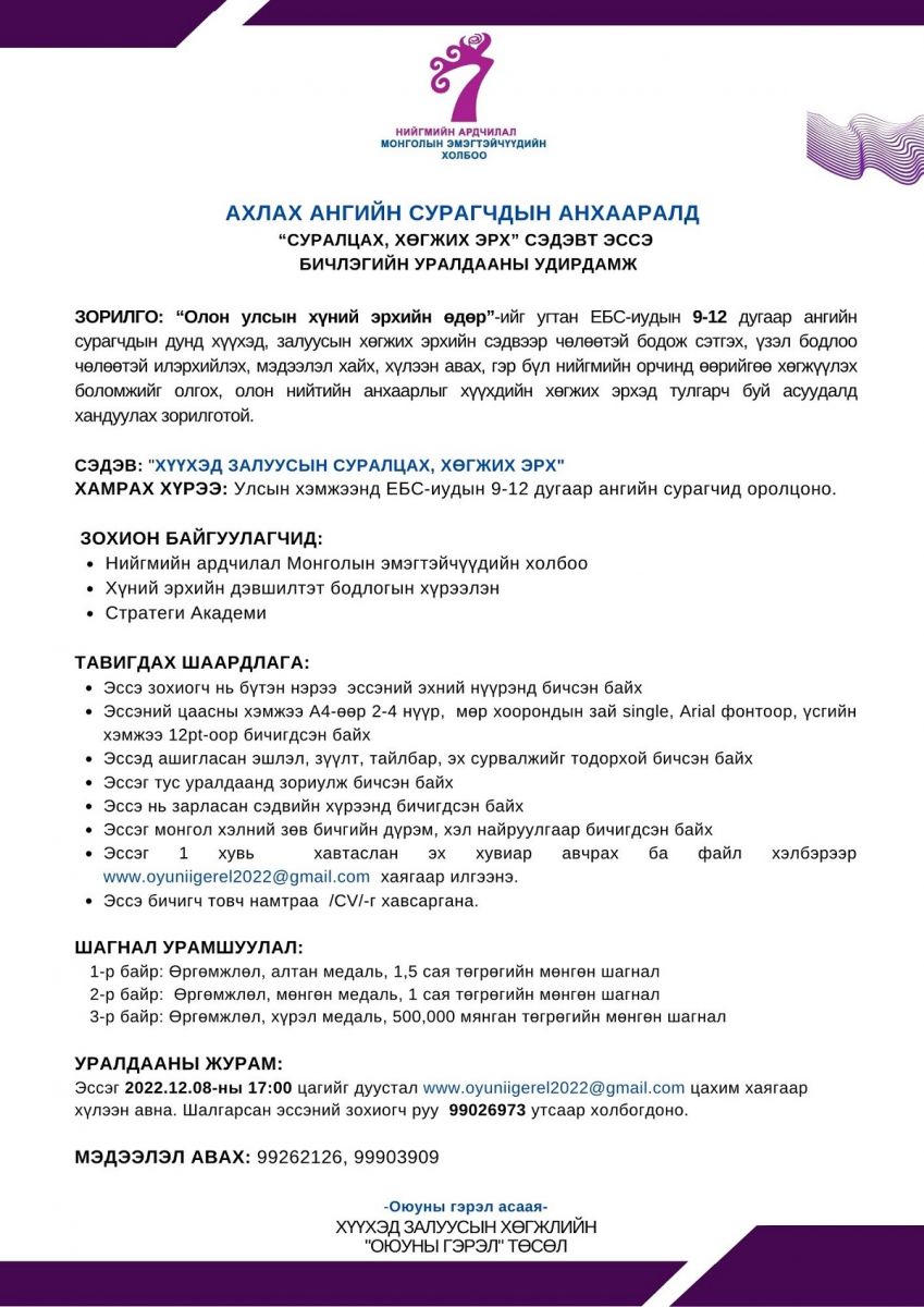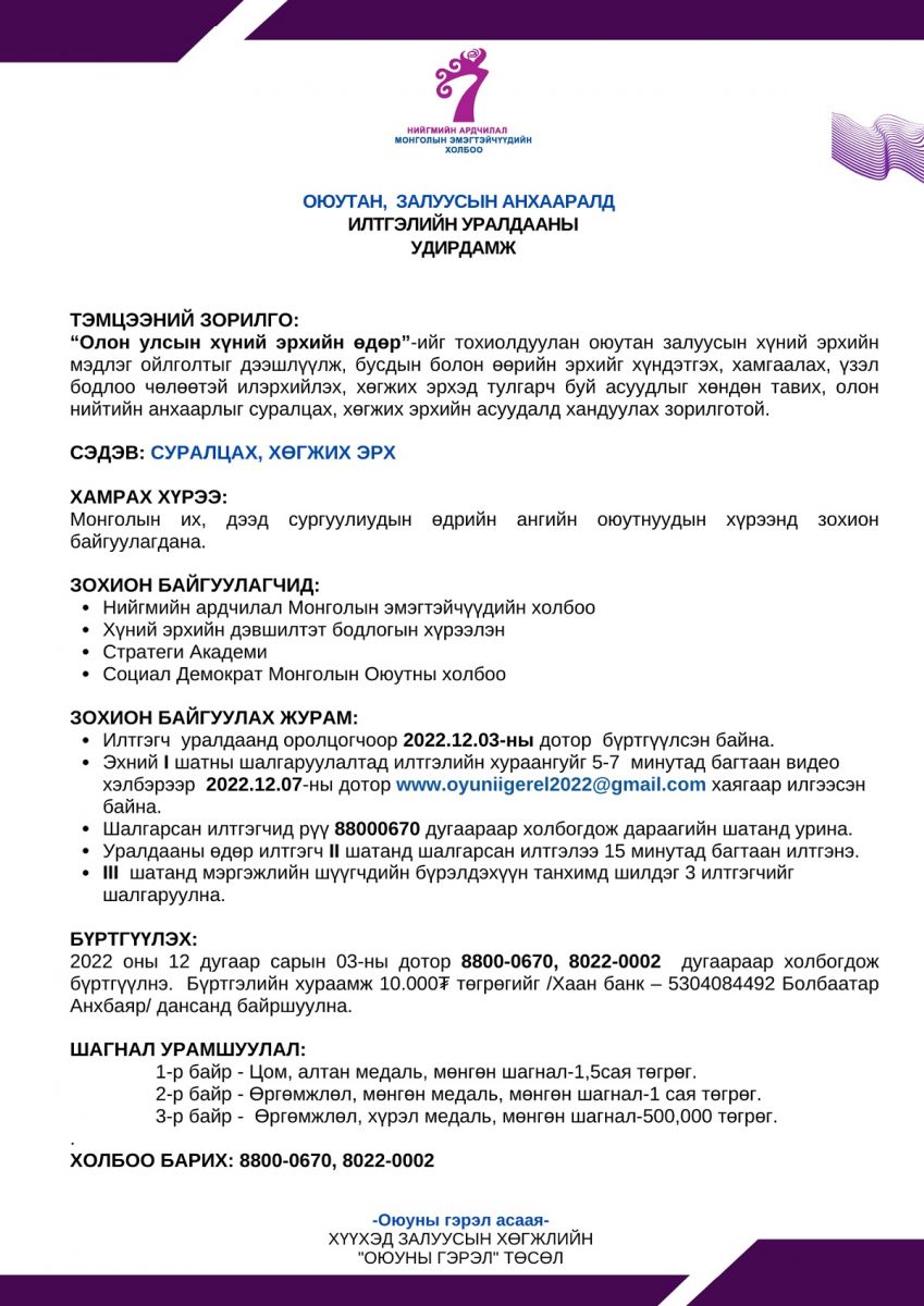 Арванхоёрдугаар сарын 10 буюу Олон улсын хүний эрхийн өдрийг тохиолдуулан хувийн хэвшлийн болон төрийн өмчит ерөнхий боловсролын дунд сургуульд суралцаж буй 5-8, 9-12 дугаар ангийн сурагч, их, дээд сургууль, коллеж, МСҮТ-д суралцаж буй өдрийн ангийн оюутан, хэвлэл мэдээллийн байгууллагад ажилладаг сэтгүүлч, хэвлэн нийтлэгч, чөлөөт уран бүтээлчдийн дунд “ХҮҮХЭД ЗАЛУУСЫН СУРАЛЦАХ, ХӨГЖИХ ЭРХ” сэдэвт уралдааныг зарлаж байна.