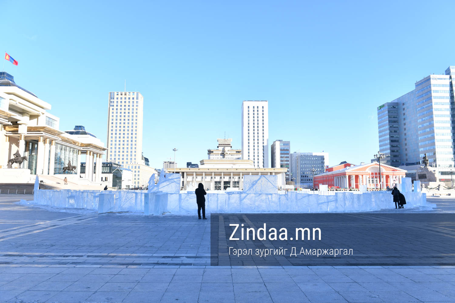 Төрийн ордны баруун урд хэсэгт мөсөн коток хийж байна. Тохижилтын ажил хараахан дуусаагүй.
