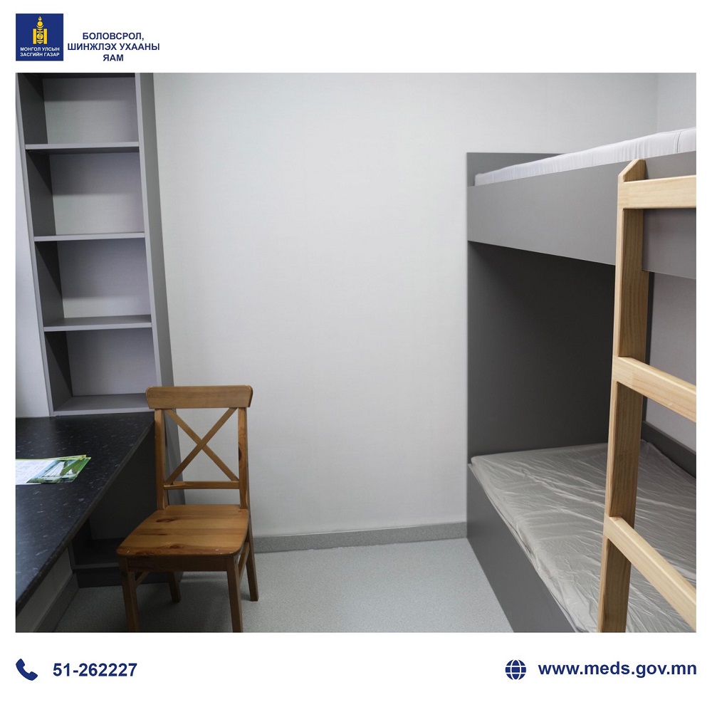 Шинэ шийдэл бүхий дотуур байрын нэг өрөөнд хоёр оюутан амьдарна. Ариун цэврийн өрөө дотроо байрлах бөгөөд тавилга, хувцасны шүүгээ, ширээ сандал, ор бүгд нэг загвараар байхаар гүйцэтгэгч байгууллага шийдвэрлэжээ. Барилгын хийцийн хувьд улирал хамаарахгүй гүйцэтгэл хийх 100 хувь боломжтой юм.