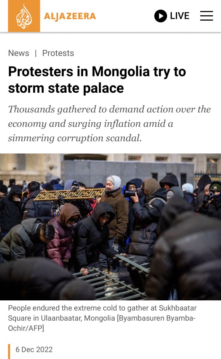 “Аль Жазера”, BBC, Латвийн англи, орос хэлээр мэдээлэл түгээдэг Meduza цахим хуудас, Казахстаны үндэсний телевиз болон хэд хэдэн нөлөө бүхий мэдээллийн сайтууд Монголын мянга мянган иргэд авлига, нүүрсний хулгай, инфляцыг эсэргүүцэж, өвлийн хүйтнийг үл хайхран эсэргүүцлийн жагсаал хийж, зарим нь Засгийн газрын ордон руу дайрахыг завдаж байна хэмээн мэдээлэв.