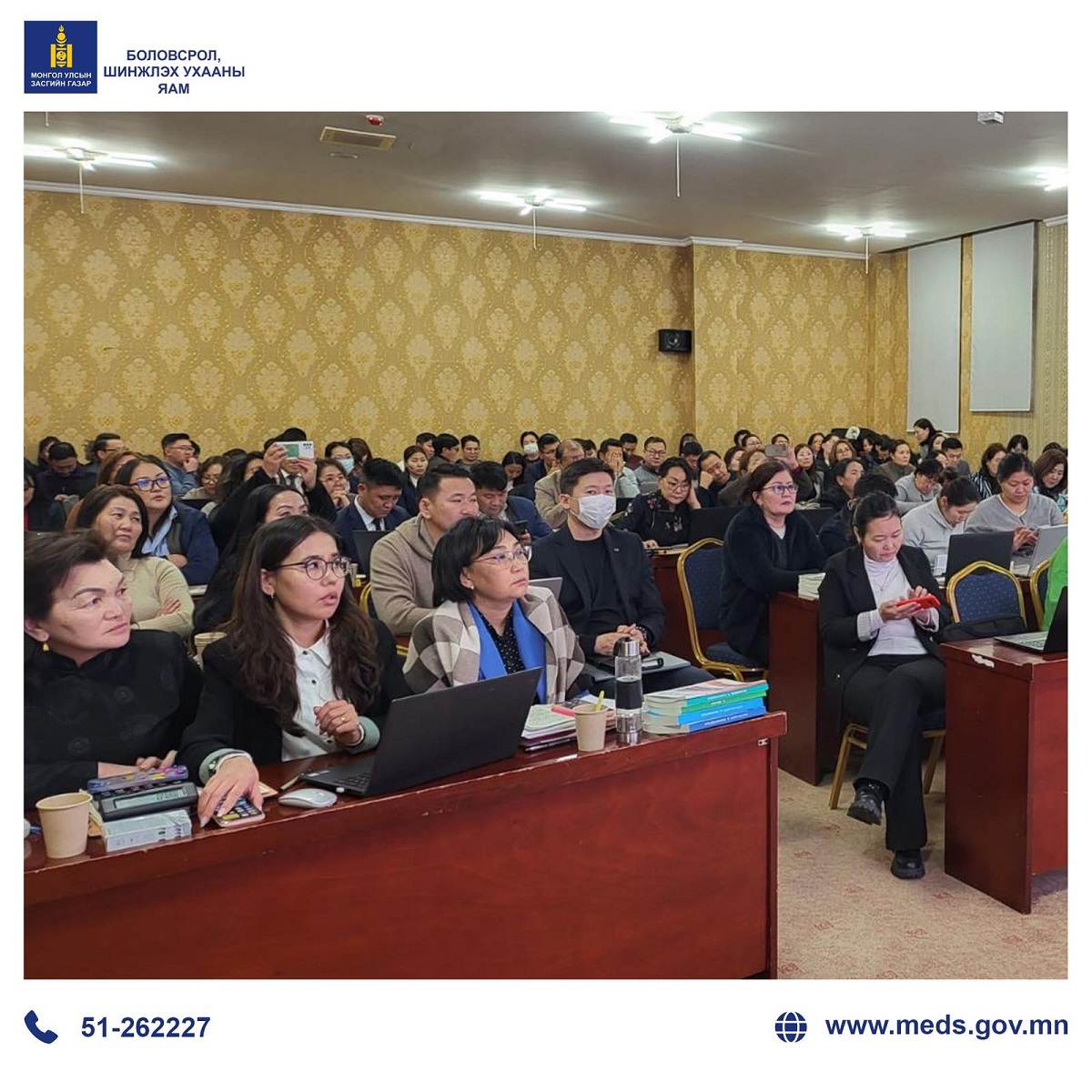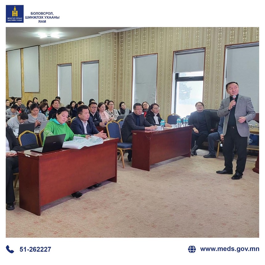 21 аймаг, 9 дүүргийн боловсрол, шинжлэх ухааны газрын мэргэжилтнүүд болон төсвийн мэргэжилтнүүд “Үр дүнд суурилсан бодлогын төлөвлөлт, арга зүй” сэдэвт сургалтад хамрагдлаа.  Сургалтыг БШУЯ-аас зохион байгуулж, Боловсролын ерөнхий газар, Боловсролын судалгааны үндэсний хүрээлэн, Боловсролын үнэлгээний төвийнхөн мэдээлэл хийв.