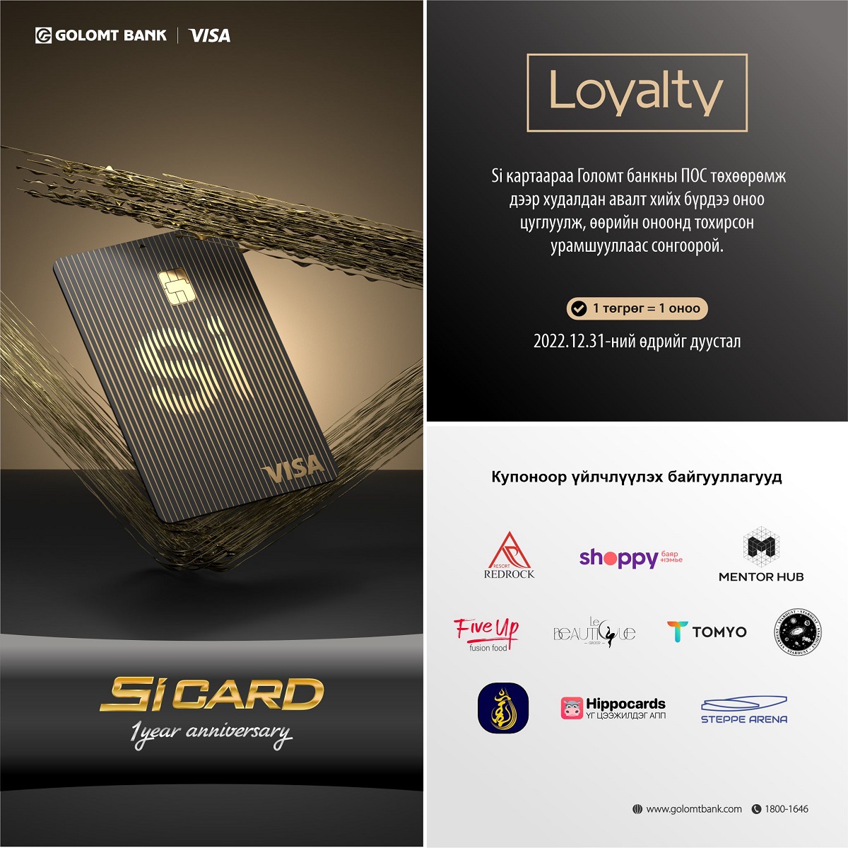 Бүтээгчдэд зориулсан Si картын 1 жилийн ойн бэлэг “Loyalty” оноотой хөтөлбөрөөр үргэлжилж байна. Та 2022.12.31-нийг дуустал Si картаар төлбөр, тооцоо хийх бүрдээ оноо цуглуулаад уг хөтөлбөрт хамтран ажиллаж буй худалдаа, үйлчилгээний байгууллагуудаар үйлчлүүлэх бэлгийн купоноо аваарай. Купоны тоо хязгаартай тул амжиж оноогоо цуглуулаад, урамшуулалд хамрагдахыг зөвлөж байна.