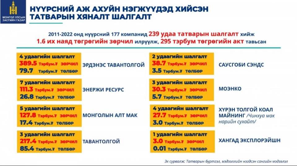 Өнгөрсөн 2011-2022 онд нүүрсний 177 компанид 239 удаа татварын шалгалт хийсэн байна. Энэ бол бага тоо биш. Улмаар 1.6 их наяд төгрөгийн зөрчлийг илрүүлж, 295 тэрбум төгрөгийн акт тавьсан байдаг" хэмээн тодотголоо.