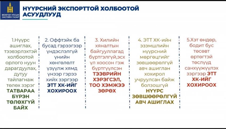 Түүнчлэн "Эх үүсвэр нь тодорхойгүй, бүрдүүлэлтгүй нүүрс гарч ирсэн байсныг илрүүлсэн. Гаалийн байгууллага 2013-2018 онд дотоод хяналт, шалгалтыг хийж гурван төрлийн үйдлийг илрүүлж, хуулийн байгууллагад шилжүүлсэн. Нэгт, гэрээгүй болон гэрээнээс илүү тоо хэмжээгээр экспортын бүрдүүлэлт хийсэн. Хоёрт, улсын хилээр хоосон гэж бүртгэгдэж гарсан тээврийн хэрэгсэл 2527 байна. Гуравт, экспортын гаалийн бүрдүүлэлтгүй 3758 тээврийн хэрэгслээр 379 мянган тонн нүүрс экспортолсон Гаалийн мэдүүлэг олдоогүй" гэсэн мэдээлэл өглөө.