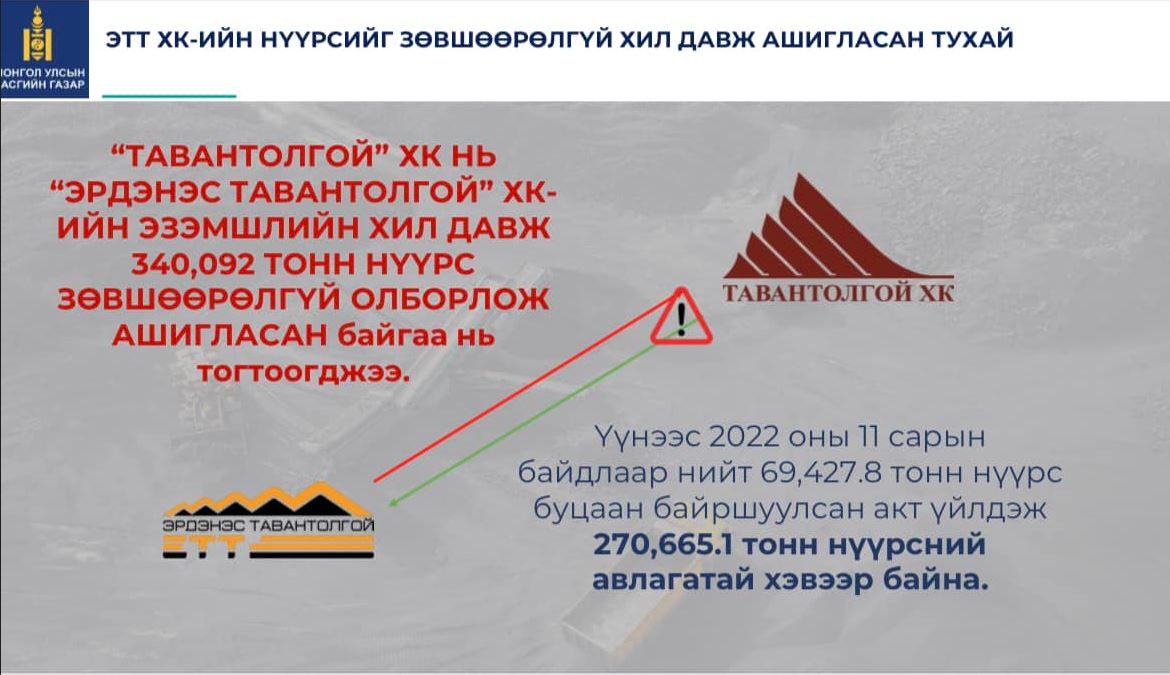 Үүнээс гадна орон нутгийн "Тавантолгой" ХК нь "Эрдэнэс Тавантолгой" компанийн эзэмшлийн талбайгаас 340 мянган тонн нүүрс зөвшөөрөлгүй олборлож ашигласан нь тогтоогдсон төдийгүй хоёр тал харилцан хүлээн зөвшөөрчээ. Үүнээс өнгөрсөн арваннэгдүгээр сарын байдлаар нийт 69427.8 тонн нүүрсийг буцааж өгсөн байна. Одоо 270 мянган тонн нүүрсний авлага үлдсэн гэх мэдээллийг Сангийн сайд Б.Жавхлан өглөө.