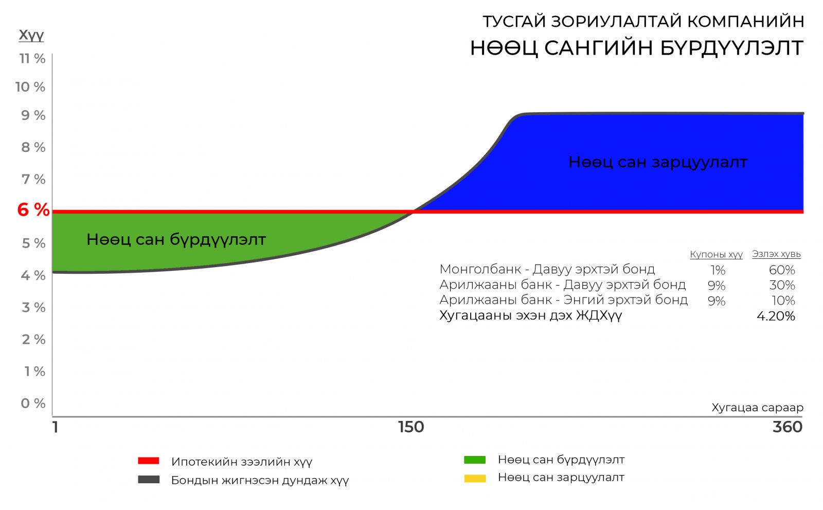 2. Ипотекийн зээлийн хүүгийн орлого тодорхой хугацаанд тасалдахад нөөц сангаас бондын хүүгийн төлбөрийг хугацаанд нь төлөхөд зориулдаг. Үүнд: