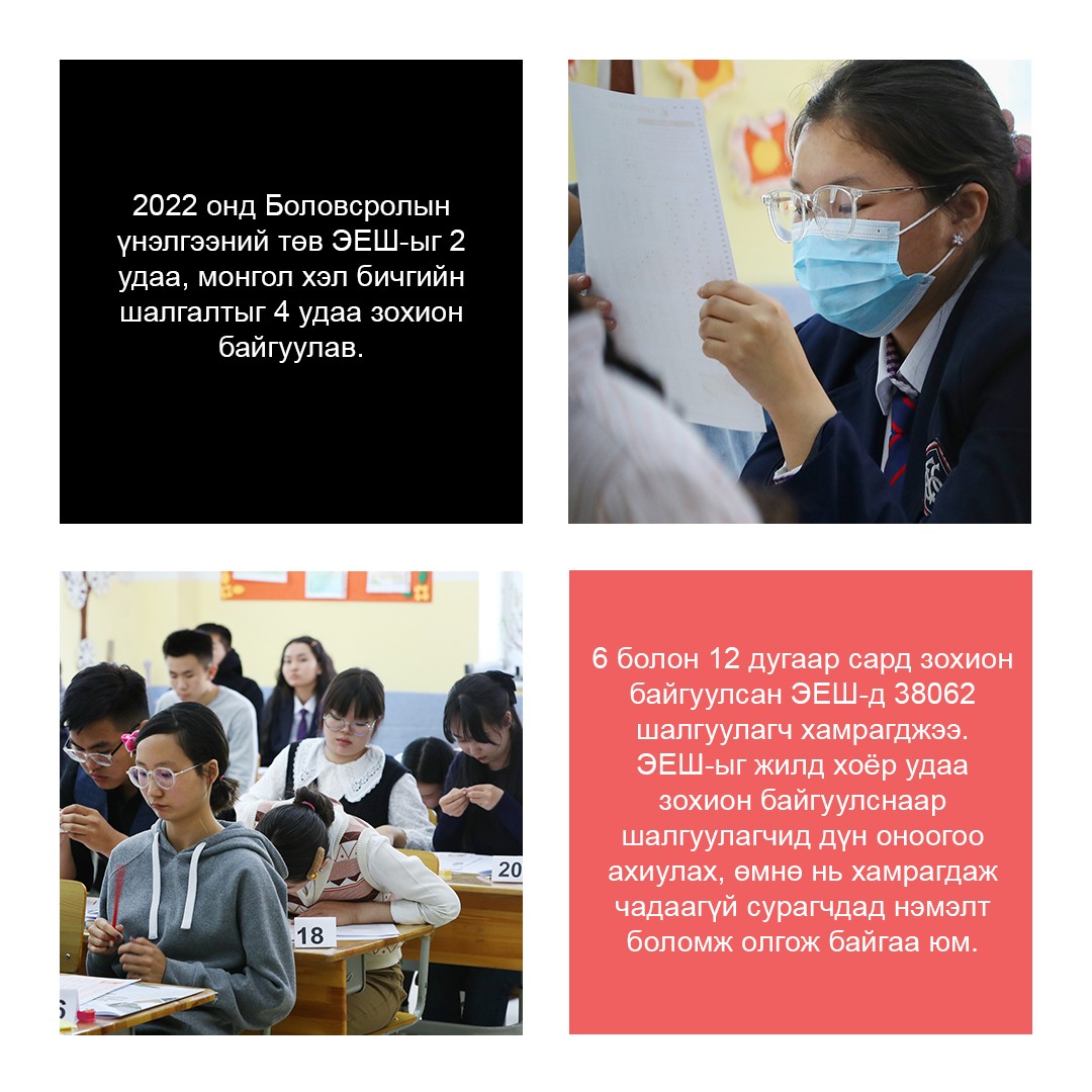 2022 онд Боловсролын үнэлгээний төв ЭЕШ-ыг 2 удаа, монгол хэл, бичгийн шалгалтыг 4 удаа зохион байгуулав. Зургаа болон арвандугаар сард зохион байгуулсан ЭЕШ-д 38062 шалгуулагч хамрагджээ.