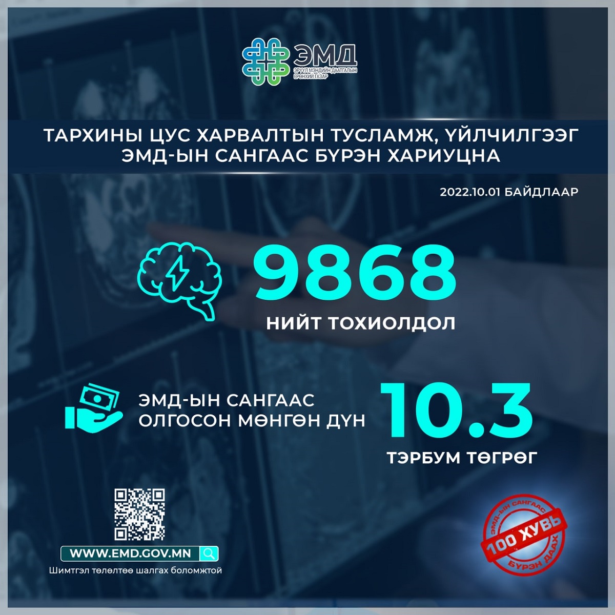 2022 оны эхний аравдугаар сарын байдлаар энэхүү тусламж, үйлчилгээний 9868 тохиолдол бүртгэгдэж, ЭМД-ын сангаас 10.3 тэрбум төгрөгийн санхүүжилт олгосон байна.