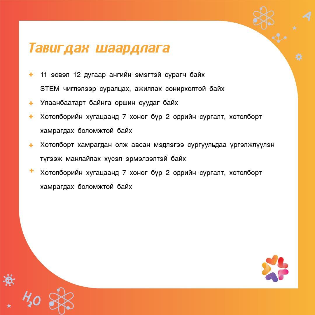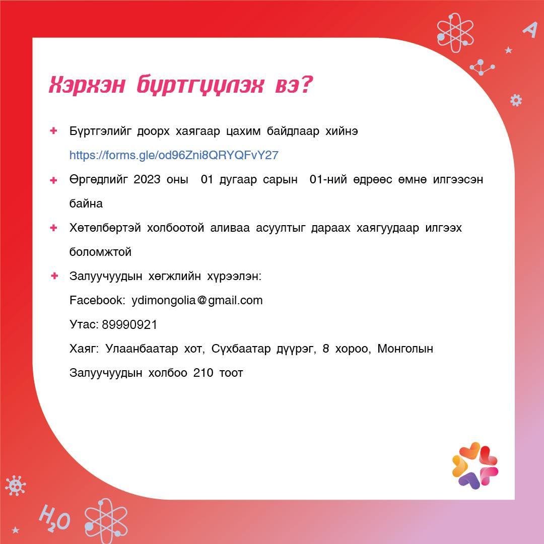 Шаардлагыг хангаж байгаа оролцогчид доорх https://forms.gle/od96Zni8QRYQFvY27 холбоосоор бүртгүүлээрэй.