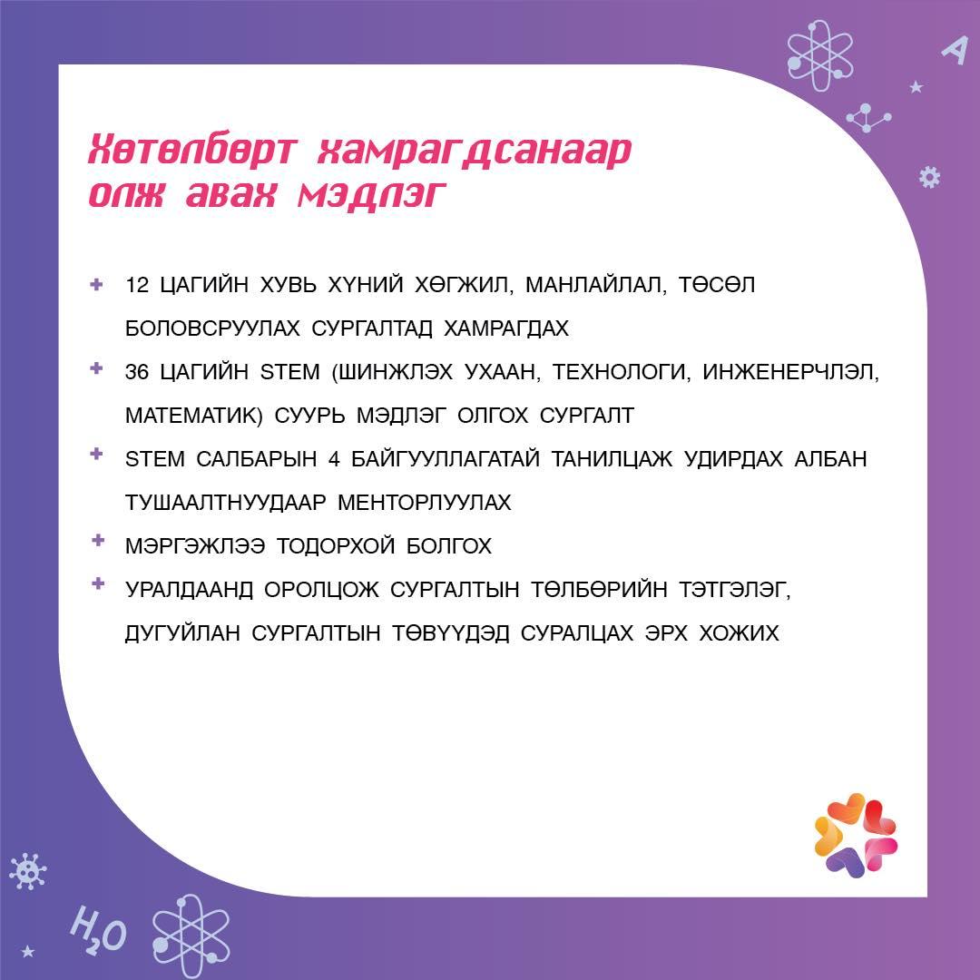 Шинжлэх ухаанч охидыг дэмжих чиглэлээр Монголд анх удаа хэрэгжих гэж буй уг хөтөлбөр нь STEM (шинжлэх ухаан, технологи, инженерчлэл, математик) салбарт мэргэжил эзэмшиж манлайлах хүсэл эрмэлзэлтэй 11 болон 12 дугаар ангийн охид оролцох боломжтой.