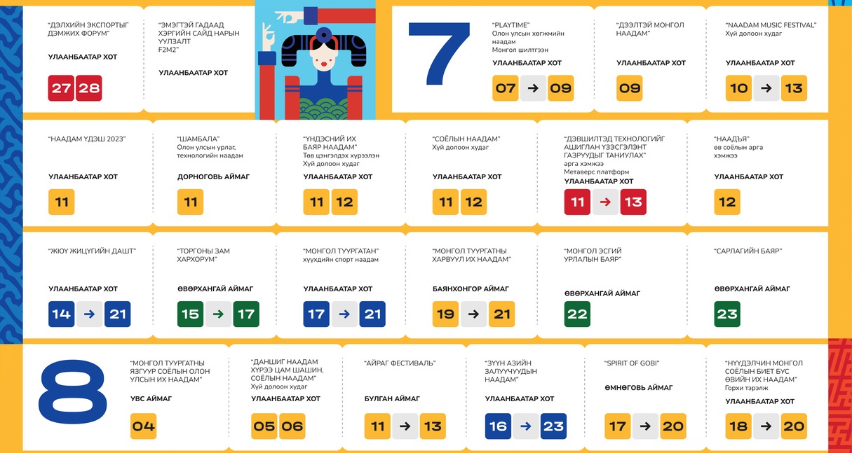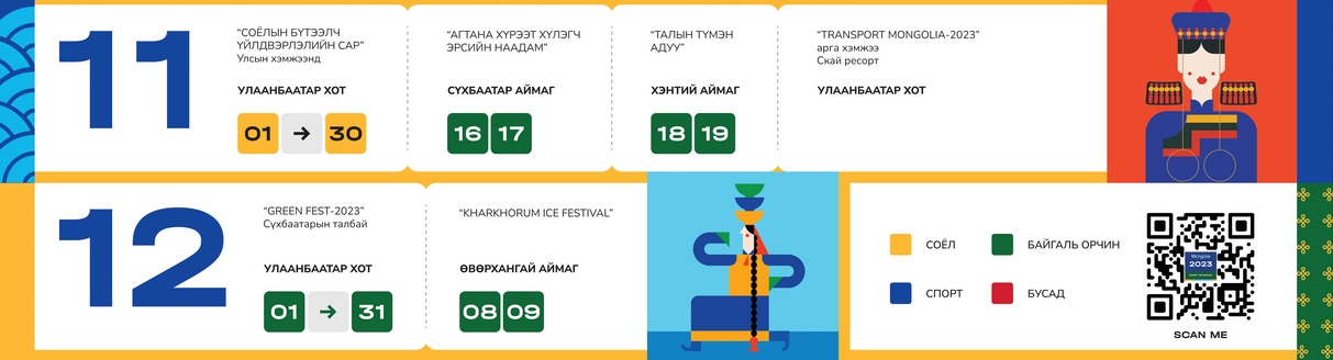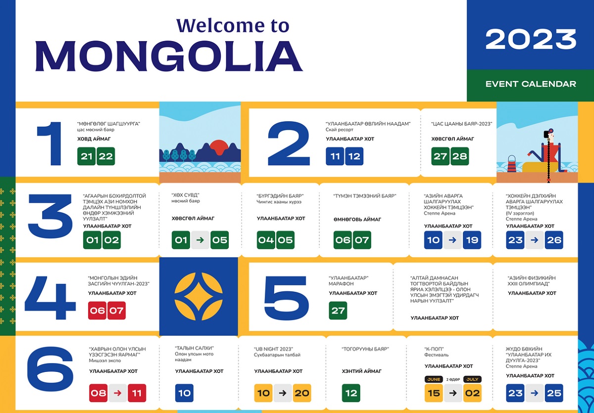 Түүнчлэн Засгийн газрын 2022 оны 11 дүгээр сарын 16-ны өдрийн “Түлхүүр үг батлах тухай” 410 дугаар тогтоолтой уялдуулан хуанлийн нэрийг “WELCOME TO MONGOLIA-EVENT 2023” гэж нэрлэж, Монгол Улсыг гадаадад сурталчлан таниулах, аялал жуулчлалын салбарын үйл ажиллагааг сэргээх, эдийн засгийг сайжруулах, хөрөнгө оруулалтыг нэмэгдүүлэхэд чиглэсэн 22 арга хэмжээг тусгасан болно.