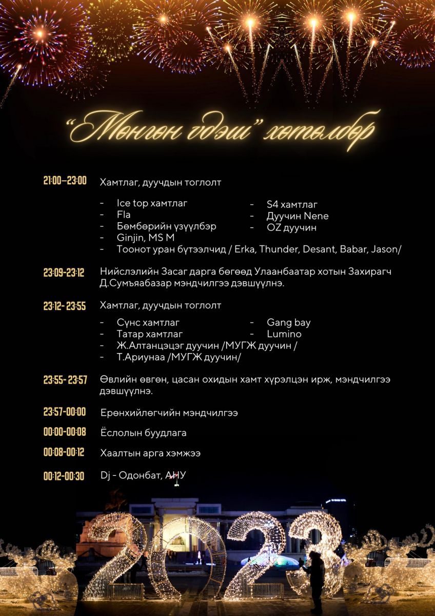 Баярын хөтөлбөрт “Lumino”, “Татар”, “Сүнс”, “Gangbay”, “Ice Top”, “S4” хамтлаг, МУГЖ дуучин Т.Ариунаа, Ж.Алтанцэцэг, реппер Nene, Ginjin, Mrs M, Fla, OZ болон “Тоонот” студийн уран бүтээлчид оролцож, нийслэлчүүдтэйгээ хамт шинэ оноо угтах юм. Тус арга хэмжээг UBS, TV8 телевиз шууд дамжуулна. Түүнчлэн он солигдох мөчид Сүхбаатарын талбай болон Монголын Хүүхдийн ордны талбайд ёслолын буудлага хийнэ.
