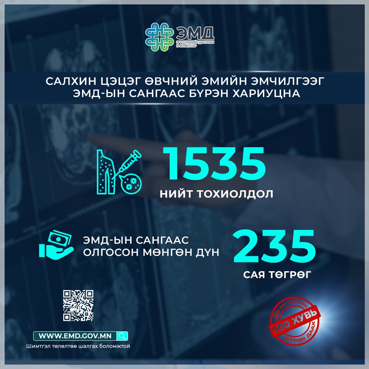 2022 оны эхний 10 сарын байдлаар энэхүү тусламж, үйлчилгээний 1535 тохиолдол бүртгэгдэж, ЭМД-ын сангаас 235 сая төгрөгийн санхүүжилт олгосон байна.