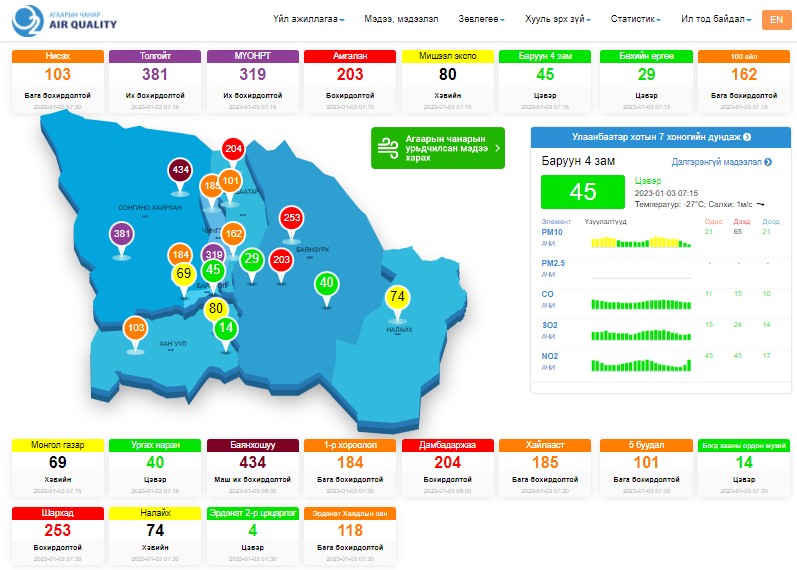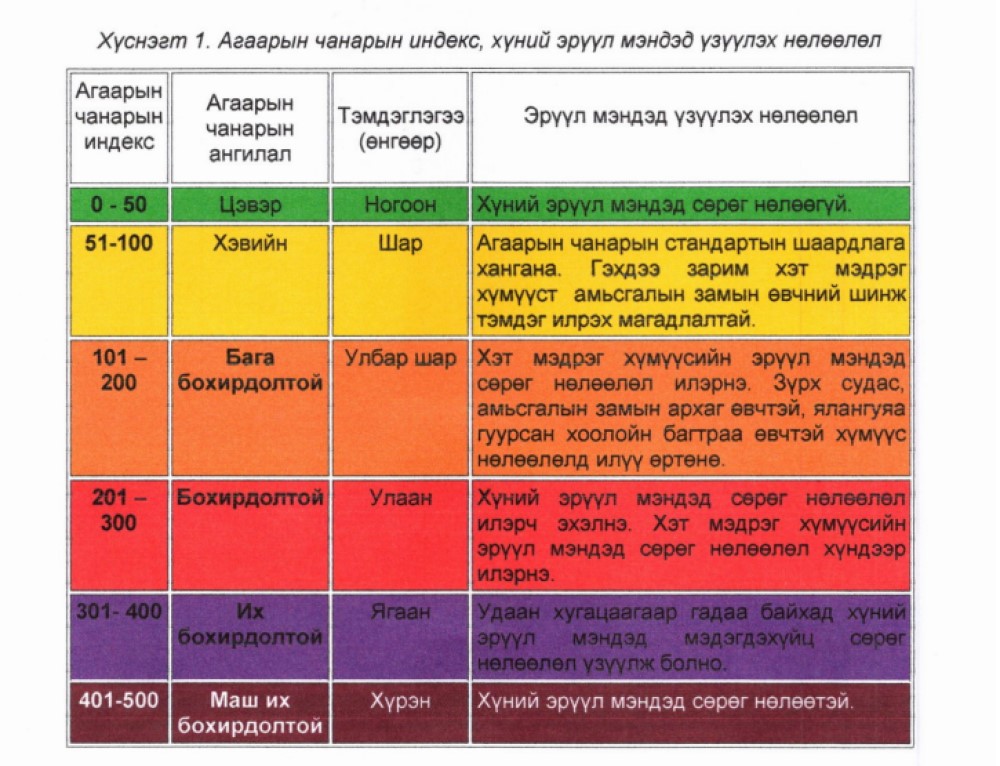 Өнөөдөр өглөөний 08:00 цагийн байдлаар Баянхошуу орчимд агаарын чанарын индекс маш муу буюу маш их бохирдолтой зааж байна. Харин Богд хааны ордон музей, Баруун дөрвөн зам, Бөхийн өргөө орчимд агаар цэвэр гэсэн үзүүлэлтийг зааж байна.