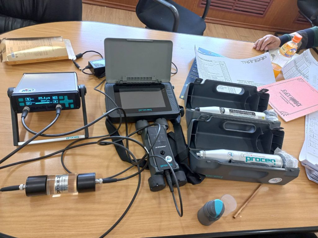 Гамшгийн судлалын үндэсний хүрээлэн нь Швед улсад үйлдвэрлэгдсэн пандит лаб, шмидт алх, профометр багажуудаар барилгын материалын нягт, цууралт, бетоны үе, аматурын зэврэлт зэргийг хэмжиж барилгын газар хөдлөлтийг тэсвэрлэх чадвар, эрсдэлийг тодорхойлж тус багаж төхөөрөмжийг ажиллагаанд оруулаад байна.