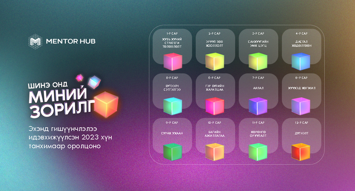 MentorHub нь хэрэглэгчдийнхээ 2023 оны зорилгын биелэлтэд менторуудынхаа чиглүүлэг, заавар зөвлөгөөг хүргэхээр “Шинэ онд миний зорилго” хөтөлбөрийг зарласан бөгөөд уг хөтөлбөрт таны амьдралын 8 талбарын тэнцвэрт эерэг нөлөө үзүүлэхүйц 12 хичээл, арга хэмжээ багтсан.